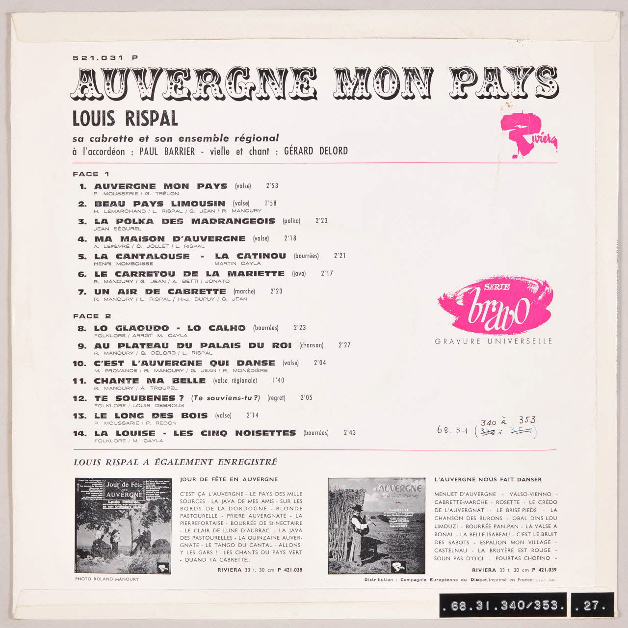 Des inscriptions sur les deux faces de la pochette et sur l'étiquette blanche et orange du disque renseignent les titres et les exécutants de l'album. Au verso de la pochette, la photographie d'autres albums de la collection.Inscriptions