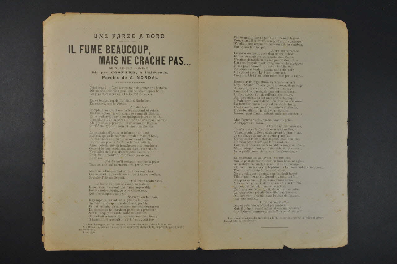 Les inscriptions renseignent le titre de la chanson, le nom des auteurs, de l'artiste et de l'éditeur. A l'intérieur, le texte du monologue. Au dos, les autres partitions de la collection.Matériaux et techniques