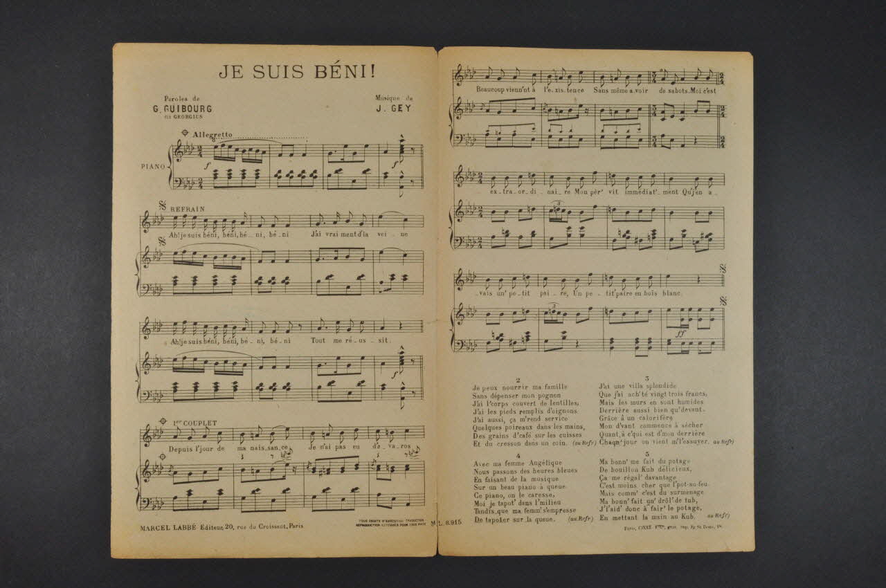 Des inscriptions renseignent le titre, les auteurs, les exécutants et l'éditeur. A l'intérieur, partition et paroles de la chanson. Au dos, liste d'autres partitions publiées par l'éditeur.Décor