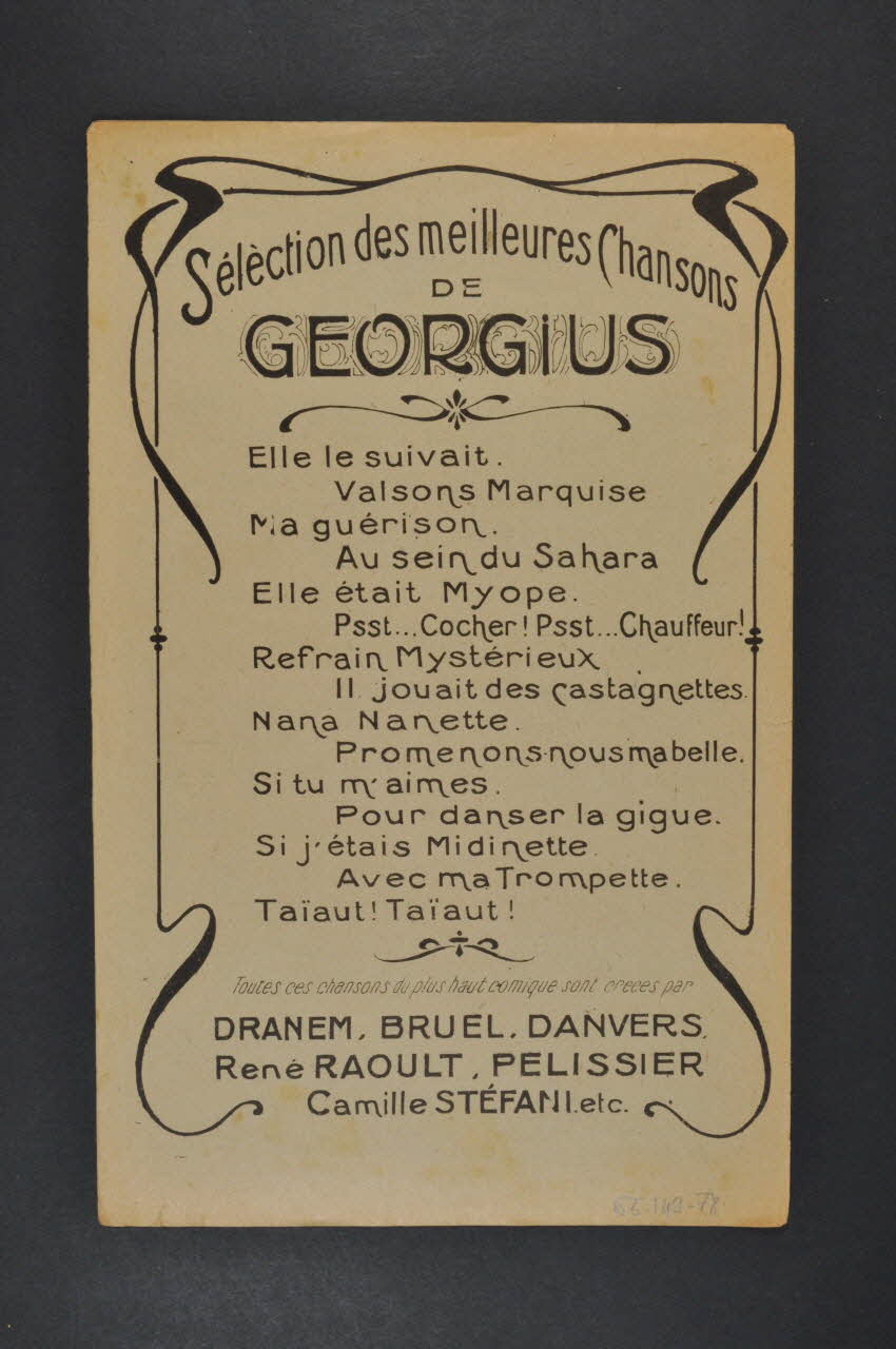 Feuillet rectangulaire en papier industriel imprimé à l'encre noire. Sur la couverture, un portrait de Georgius dansant.