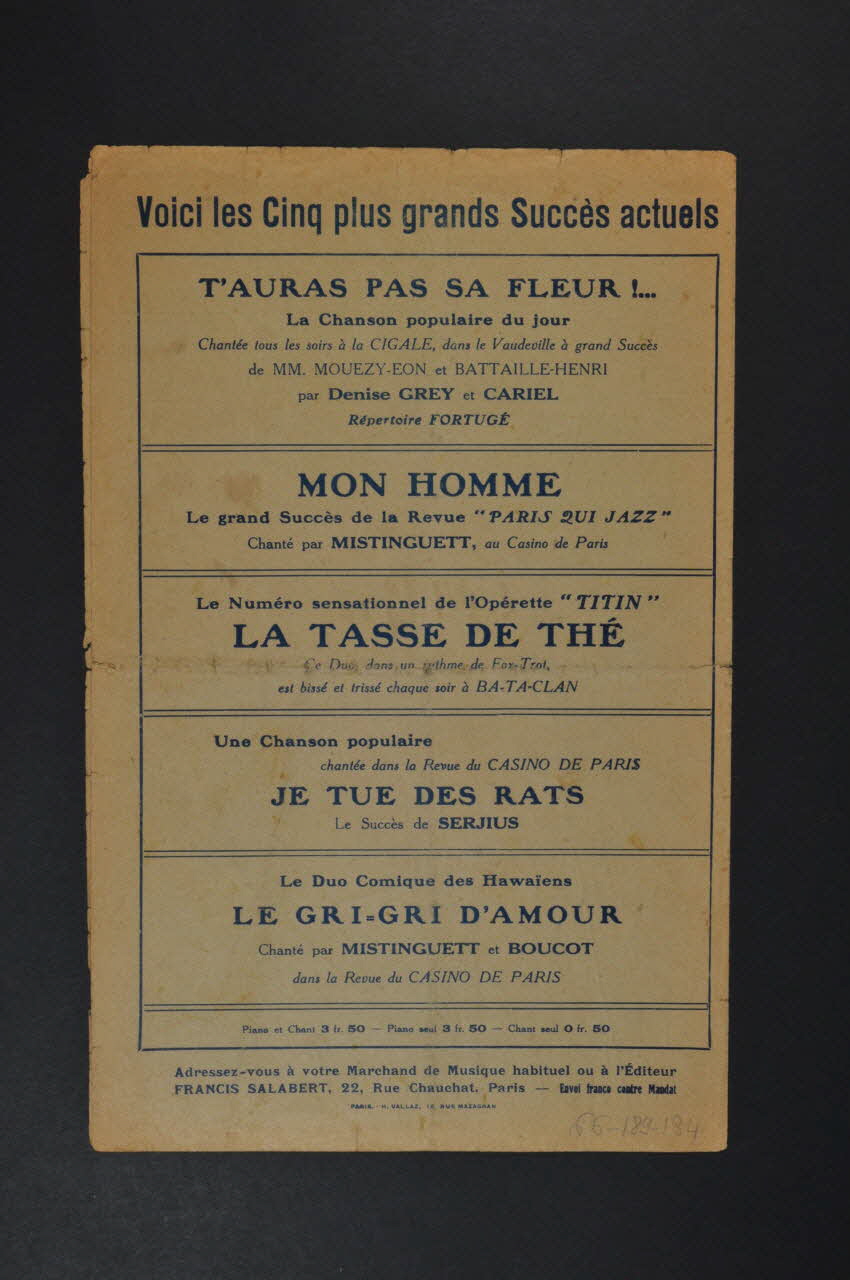 Les inscriptions renseignent le titre de la chanson, le nom des auteurs, de l'artiste et de l'éditeur. A l'intérieur, partitions et paroles de la chanson. Au dos, liste d?autres partitions publiées par l?éditeur.Décor