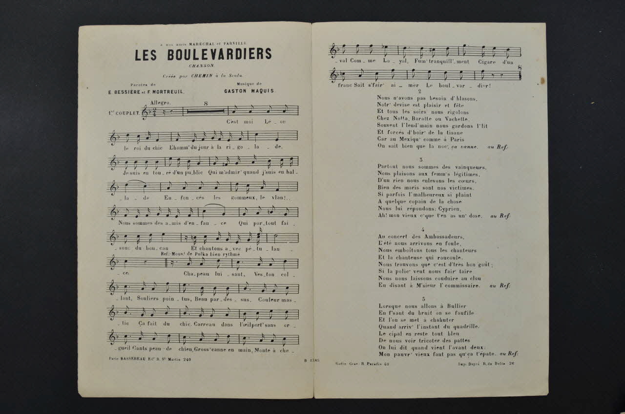 Des inscriptions renseignent le titre, les auteurs, les exécutants et l'éditeur. A l'intérieur, partition et paroles de la chanson. Au dos, liste d'autres partitions publiées par l'éditeur.Décor