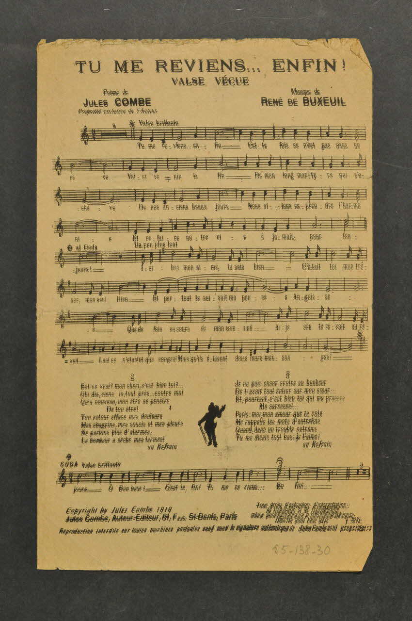 Des inscriptions renseignent le titre, les auteurs, les exécutants et l'éditeur. Au dos, partition et paroles de la chanson. L'impression est floue. L'intérieur est laissé vierge.Décor