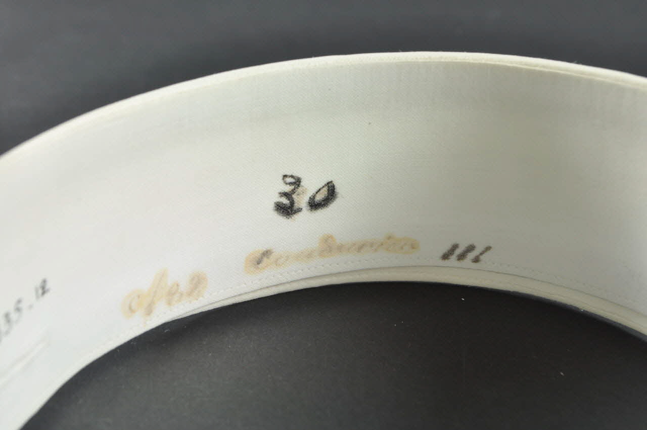 Bande de toile enduite blanche rigide repliée sur elle-même dans le sens de la largeur, courbée, avec trois boutonnières (une à chaque extrémité, une au milieu).