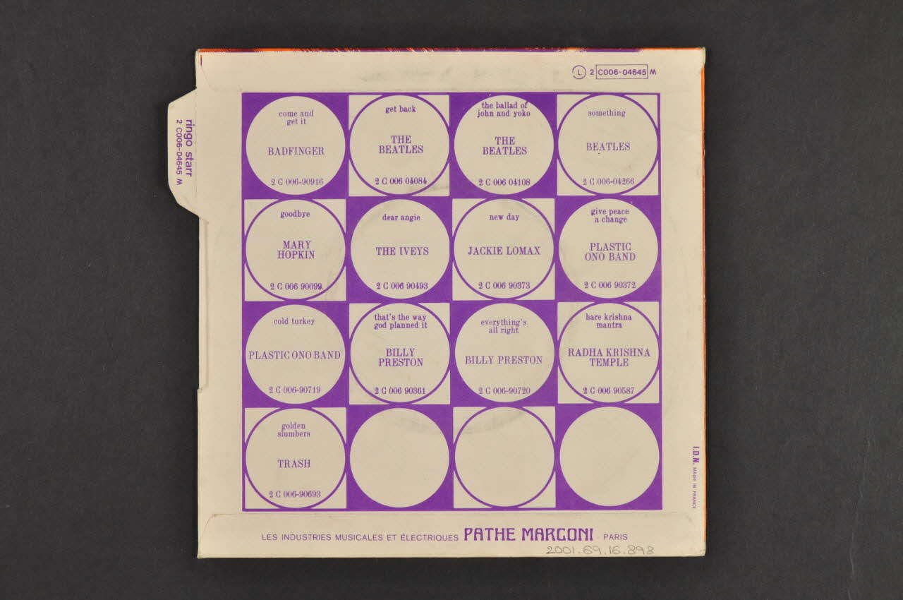 Le recto comporte le nom de l'artiste et le titre des chansons en blanc dans le coin supérieur droit. Une pomme blanche figure dans le coin supérieur gauche. Le reste du recto est occupé par le visage d'un homme vu de trois-quarts, dans des tons oranges. Le verso contient des cercles violets avec des inscriptions violettes sur fond blanc. Un onglet blanc contenant une inscription en violet se trouve le long de la bordure gauche.Matériaux et techniques