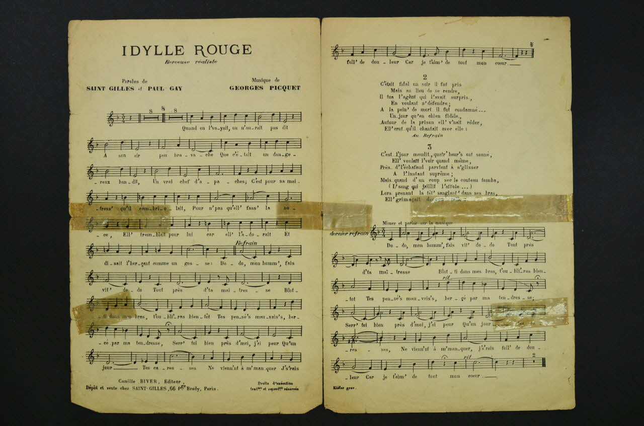 La couverture du feuillet présente le portrait photographique d'un homme en buste dans un cadre rectangulaire (portrait du chanteur Saint-Gilles ?) Les inscriptions renseignent le titre de la chanson, le nom des auteurs, de l'artiste et de l'éditeur. A l'intérieur, partition et paroles de la chanson. Le dos est vierge. Plusieurs dépôts et morceaux de rubans adhésifs datant d'une réparation antérieure. Le ruban a été appliqué sur les déchirures à l'intérieur et en couverture du feuillet.Décor