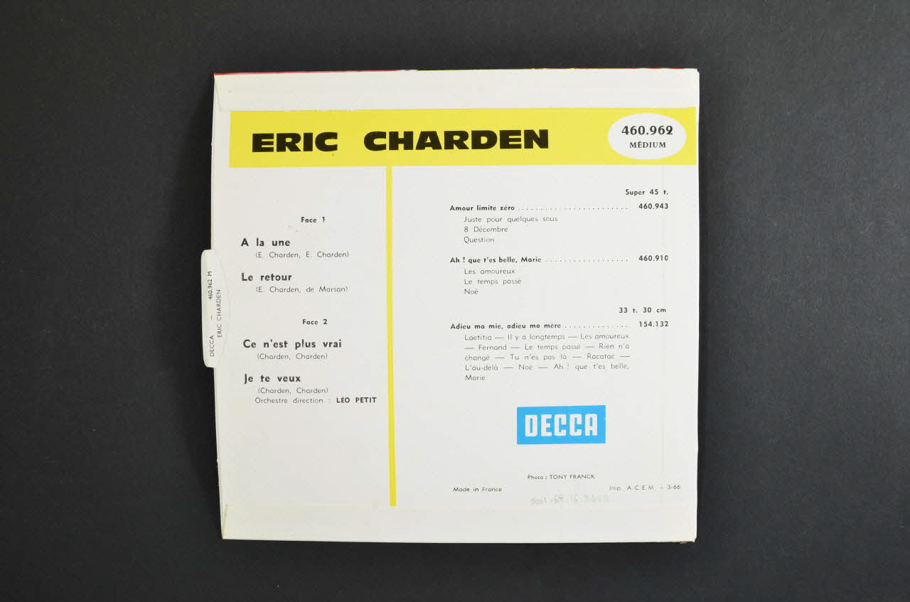 Au recto le fond représente la photo, en couleur, du chanteur assis, avec une guitare. A gauche figurent des inscriptions en noir et bleu. Au verso, le fond est blanc et jaune avec des inscriptions noires.Matériaux et techniques