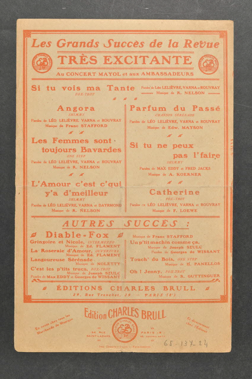 Des inscriptions renseignent le titre, les auteurs, les exécutants et l'éditeur. A l'intérieur, partition et paroles de la chanson. Au dos, liste d'autres partitions publiées par l'éditeur.Décor