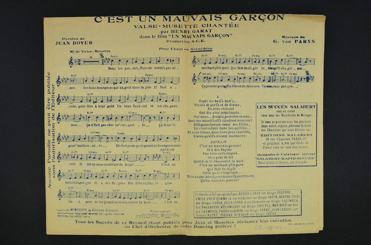 Les inscriptions précisent l'auteur de la chanson, les interprètes et l'éditeur du feuillet. L'intérieur et le dos comportent la partition et les paroles.Décor