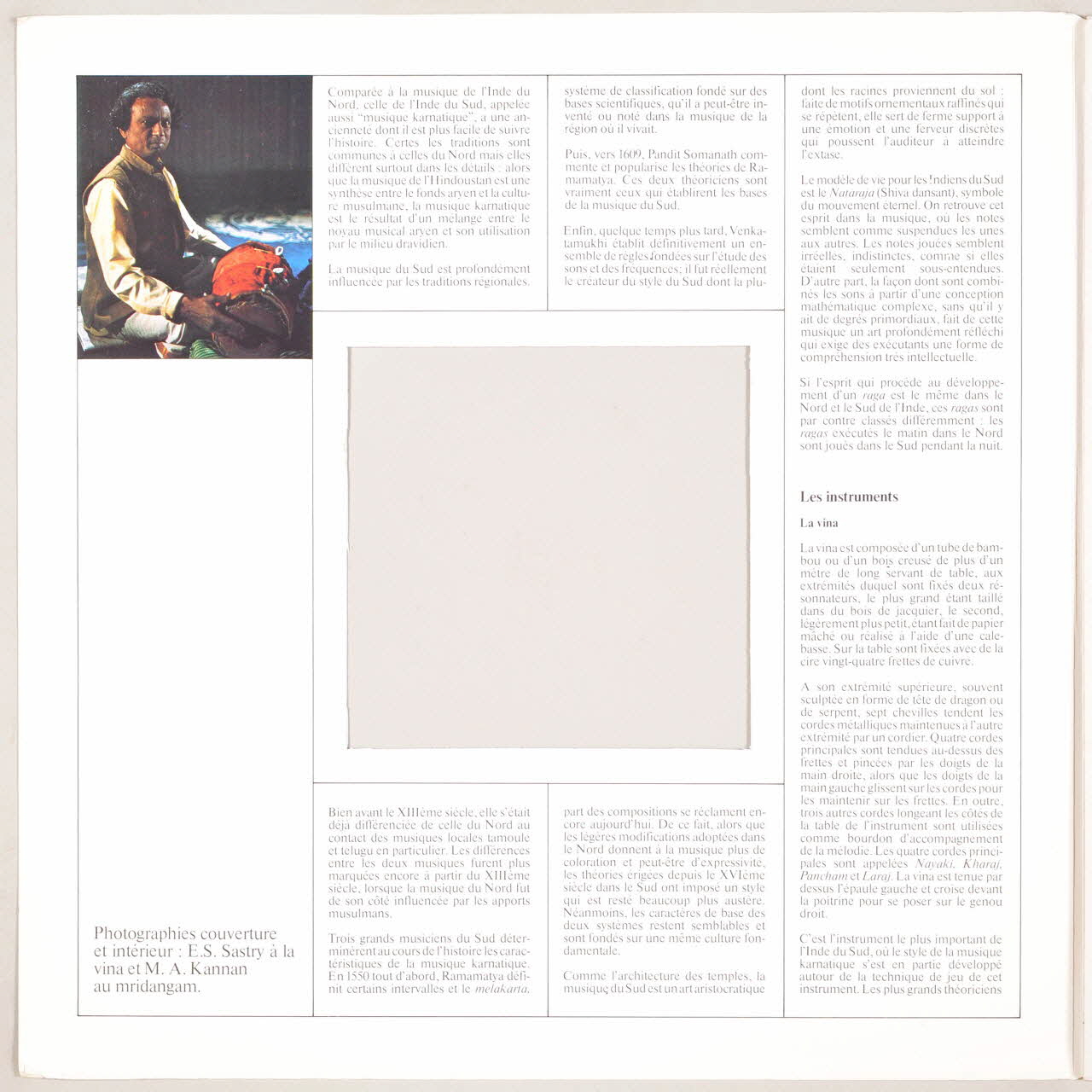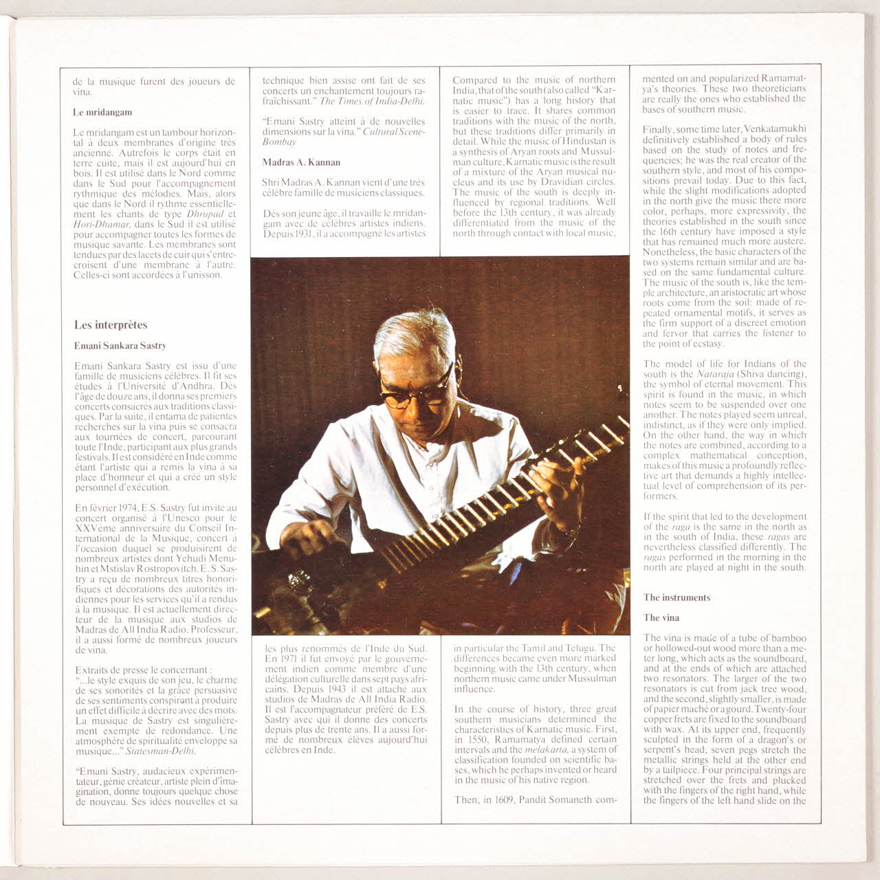 La pochette présente au centre la photographie de Emani Sankara Sastry jouant de la vina sur fond noir.