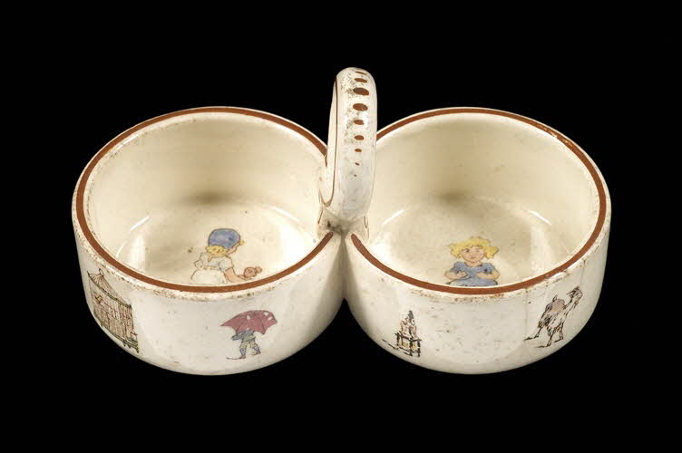 deux récipients cylindriques accolés avec une anse circulaire évidée, décor : enfants, coq, bateau, etc ...Matériaux et techniques