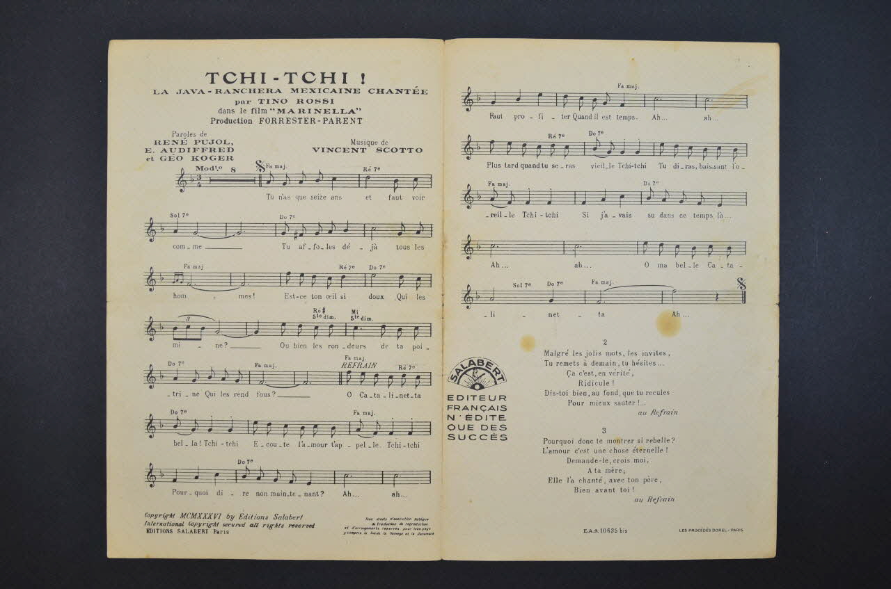Sur la couverture, le portrait photographique de Tino Rossi, de profil ; à l'arrière-plan, groupe de musiciens jouant de la guitare. Les inscriptions renseignent le titre de la chanson et du film, le nom des auteurs, de l'artiste et de l'éditeur.