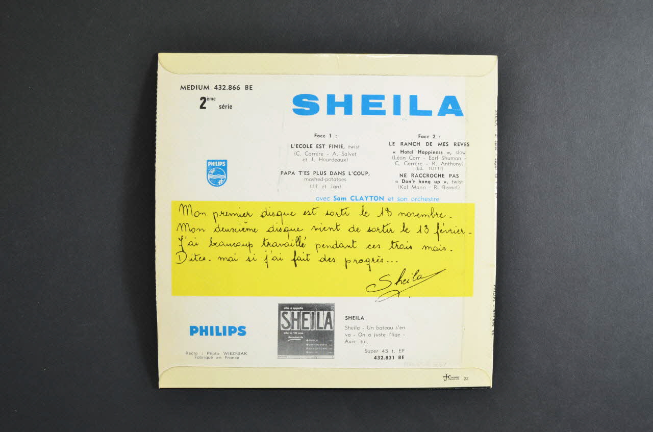 Le recto comporte une photographie couleur de la chanteuse. Le nom de l'artiste est inscrit en rose dans la partie inférieure noire. Les titres des chansons sont inscrits dans la partie supérieure, en rose sur une bande blanche. Le logo de l'éditeur est dans l'angle inférieur gauche. Le verso contient le nom de l'artiste, les titres des chansons, et le logo de l'éditeur sur fond blanc. Au centre, il y a un court message de la chanteuse sur un rectangle jaune.Matériaux et techniques