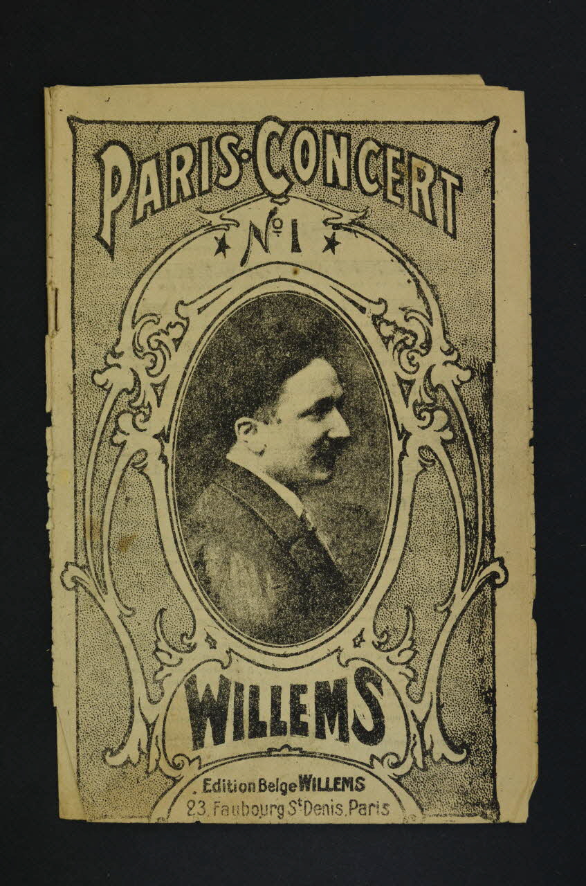 Feuillet rectangulaire de quatre pages en papier industriel, imprimé à l?encre noire. La couverture du feuillet présente la photographie de Willems.