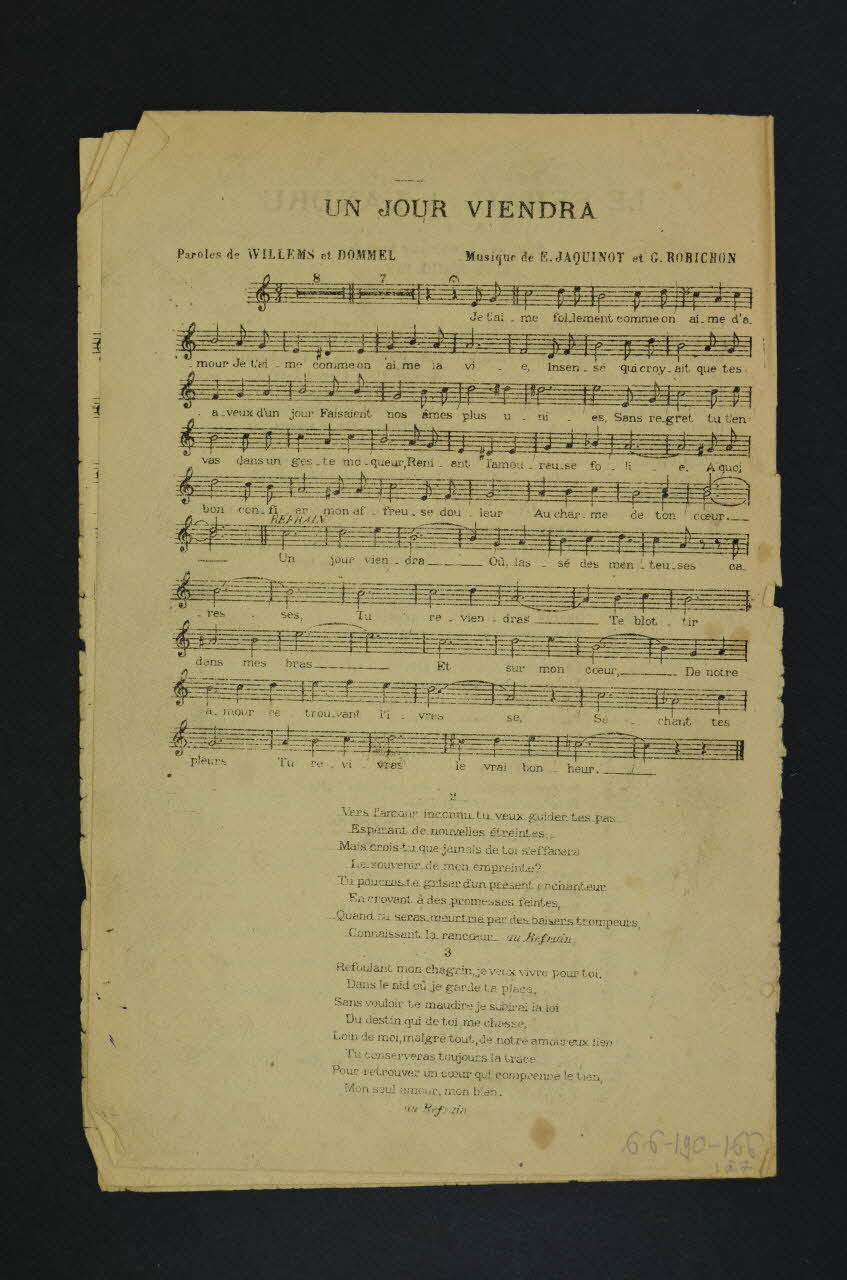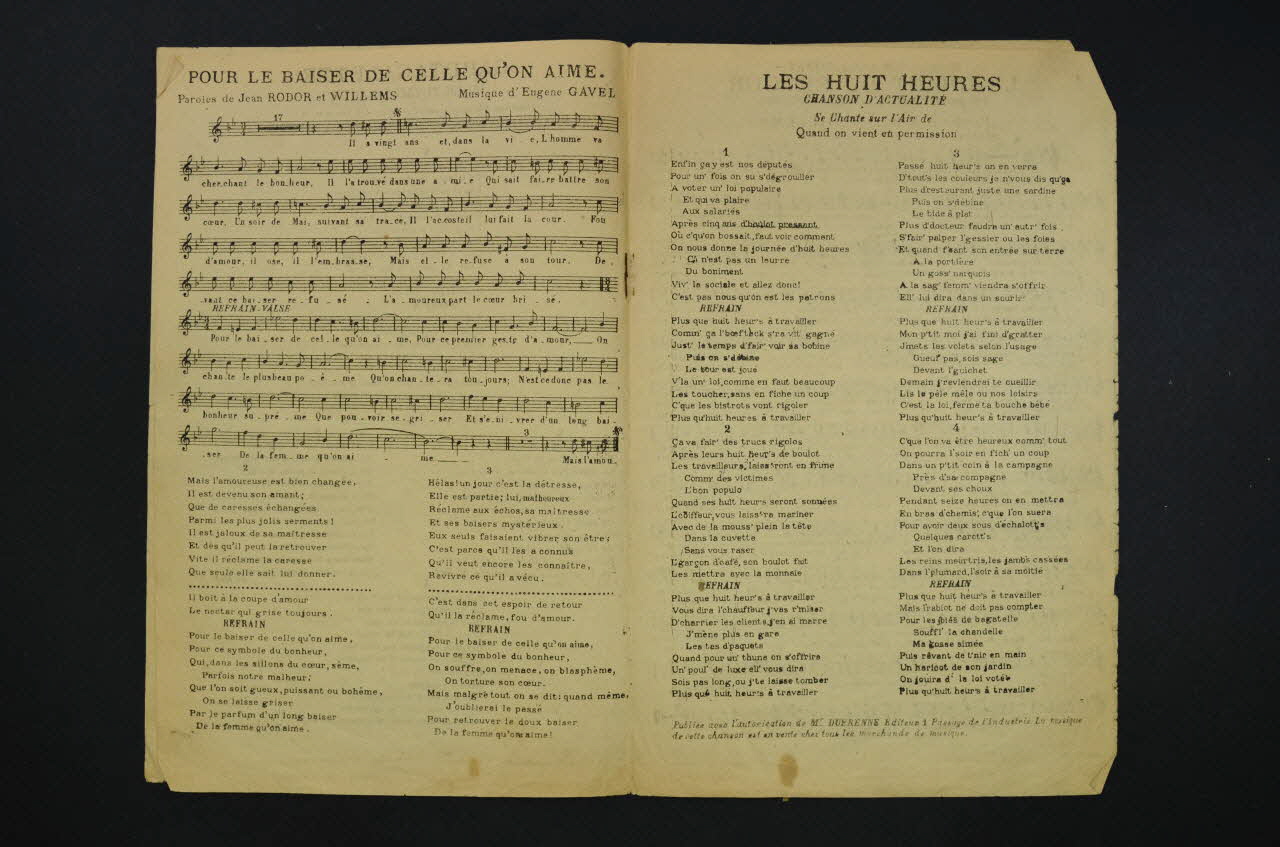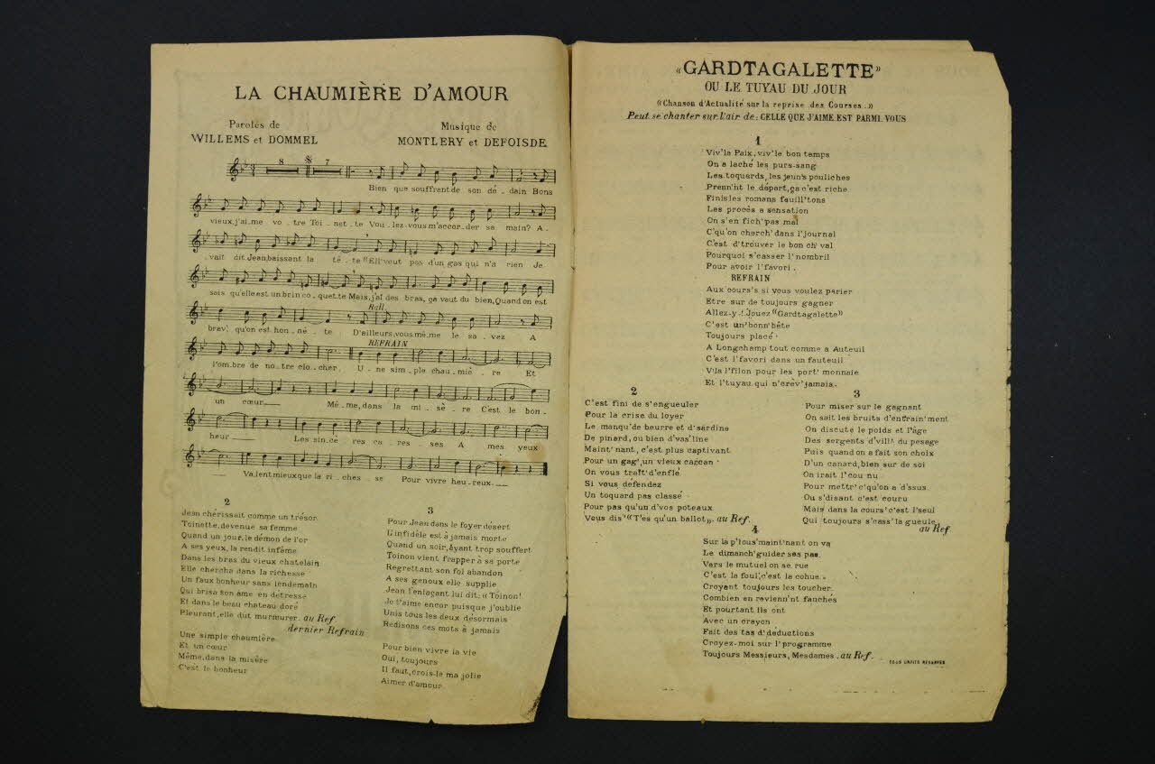 Les inscriptions renseignent le titre de la chanson, le nom des auteurs, de l'artiste et de l'éditeur. A l'intérieur et au dos, les partitions et paroles des chansons.Décor