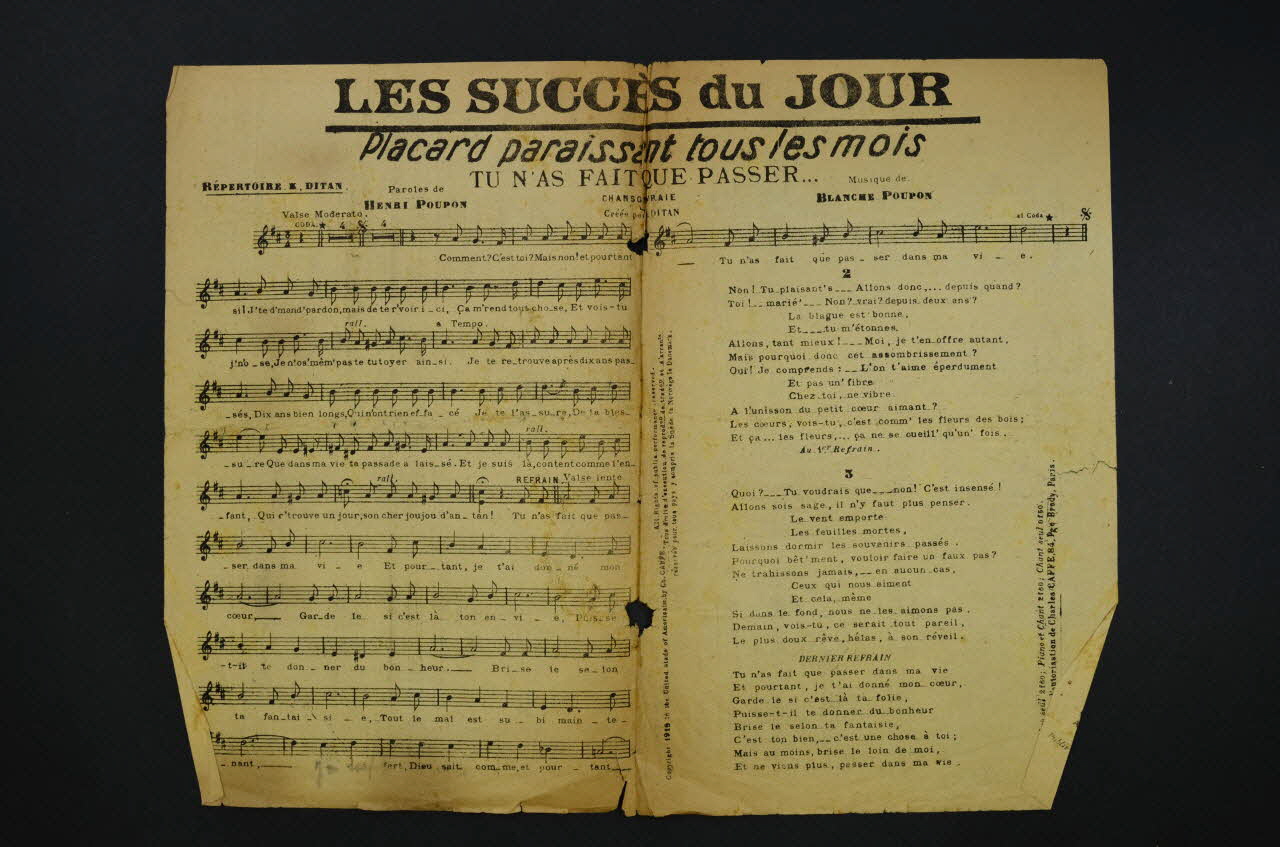 Des inscriptions renseignent le titre, les auteurs, les exécutants et l'éditeur. A l'intérieur, partition et paroles de la chanson. Au dos, les paroles de la dernière chanson.Matériaux et techniques