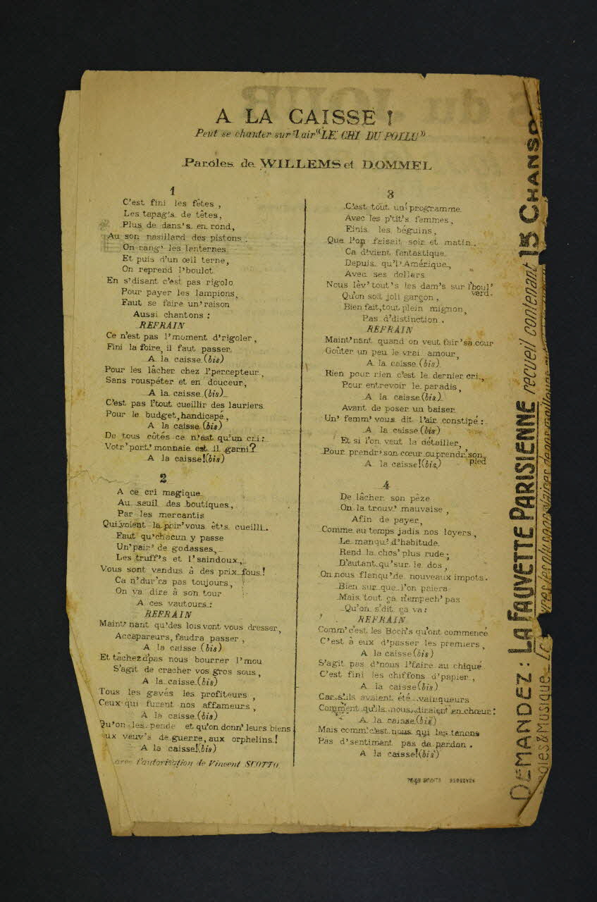 De : Date : 1919Pour ne pas voir pleurer // A la caisse ! / Tu n'as fait que passer / A la caisse! // Pour ne pas voir pleurer / A la caisse ! / Tu n'as fait que passer