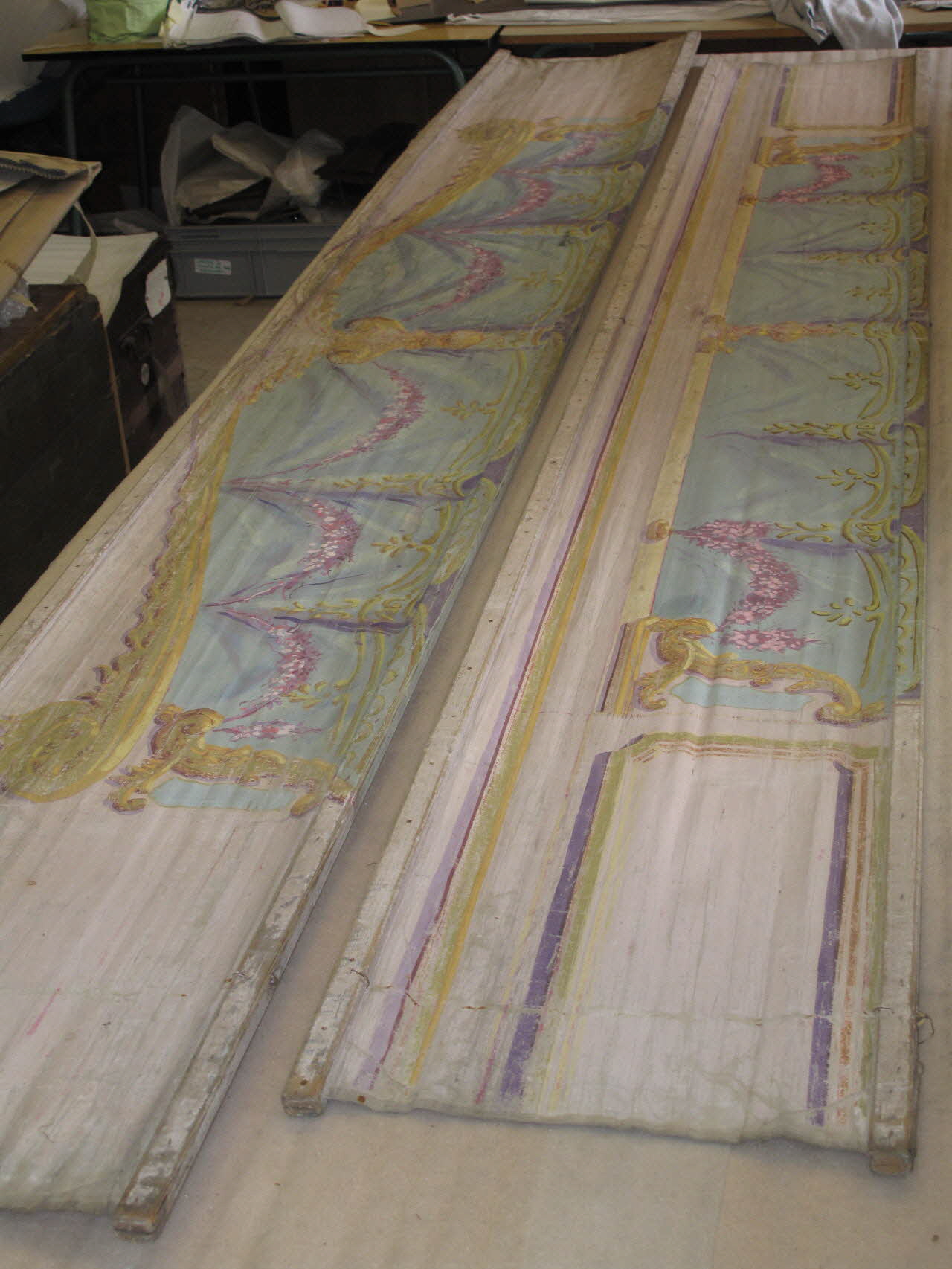 toile peinte à la colle, fixée aux extrémités entre deux baguettes de suspension en bois clouées entre elles ; / Ce décor est un lot de deux frises identiques peintes sur les deux faces, représentant des boiseries dorées style Louis XV.Décor