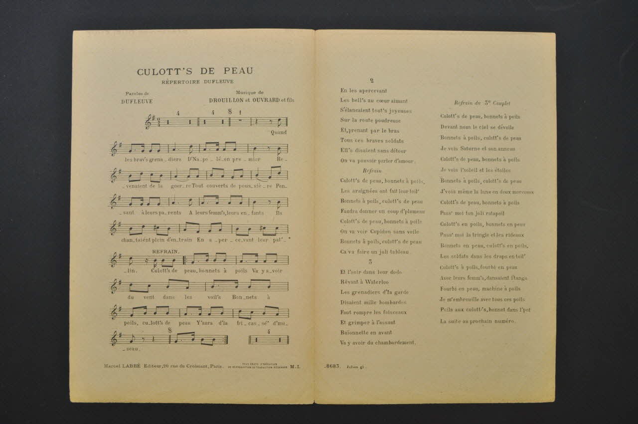 Feuillet rectangulaire en papier industriel imprimé à l'encre noire. L'intérieur présente les paroles et la partition de la chanson. Au dos, publicité pour l'éditeur.Matériaux et techniques