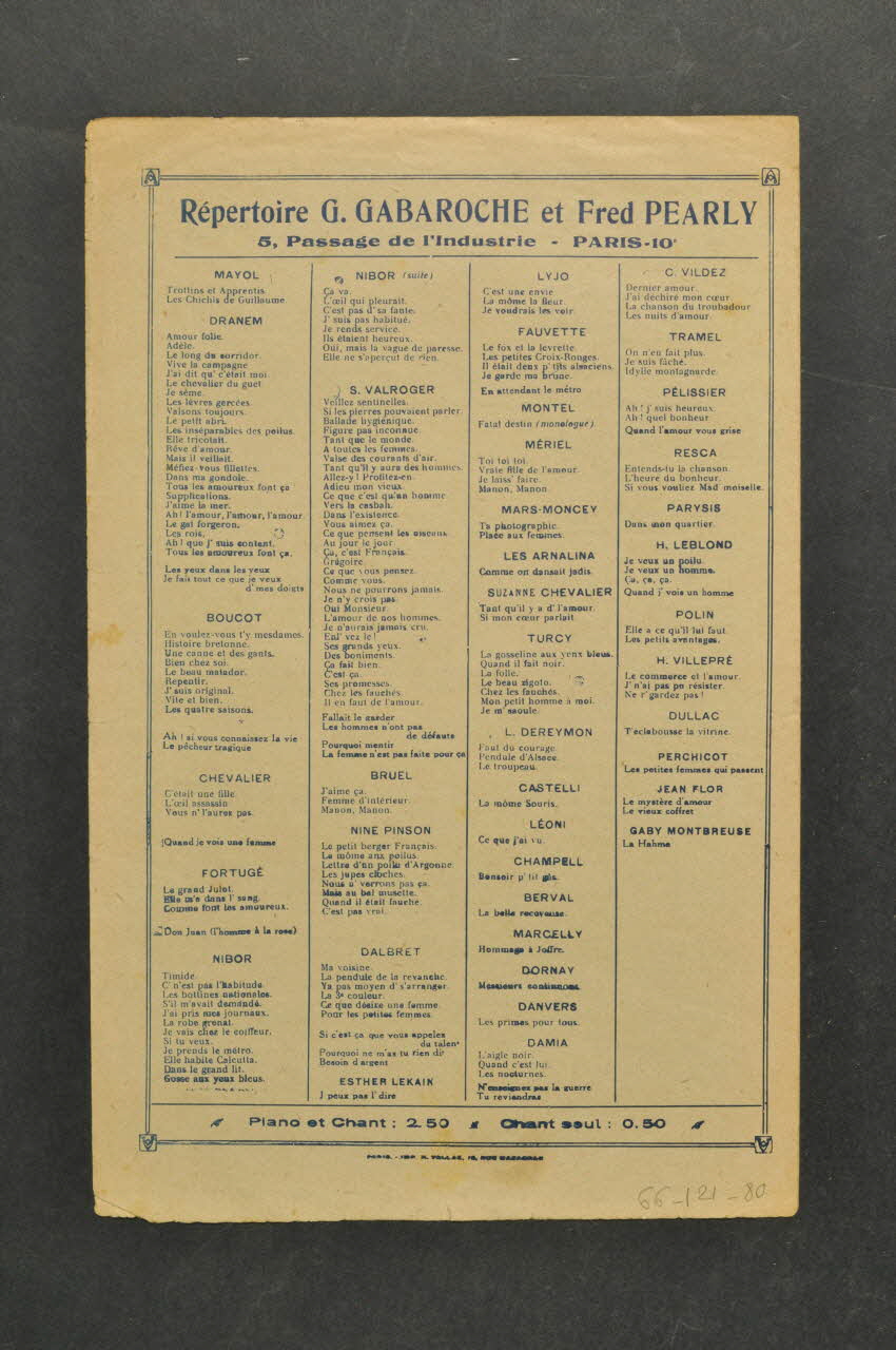 Des inscriptions renseignent le titre, les auteurs, les exécutants et l'éditeur. A l'intérieur, partition et paroles de la chanson. Au dos, liste d'autres partitions publiées par l'éditeur.Décor