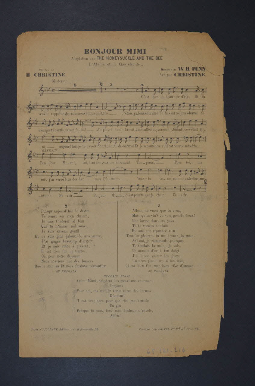 Les inscriptions renseignent le titre de la chanson, le nom des auteurs, de l'artiste et de l'éditeur. Au dos, partition et paroles de la chanson. L'intérieur est laissé vierge.Décor