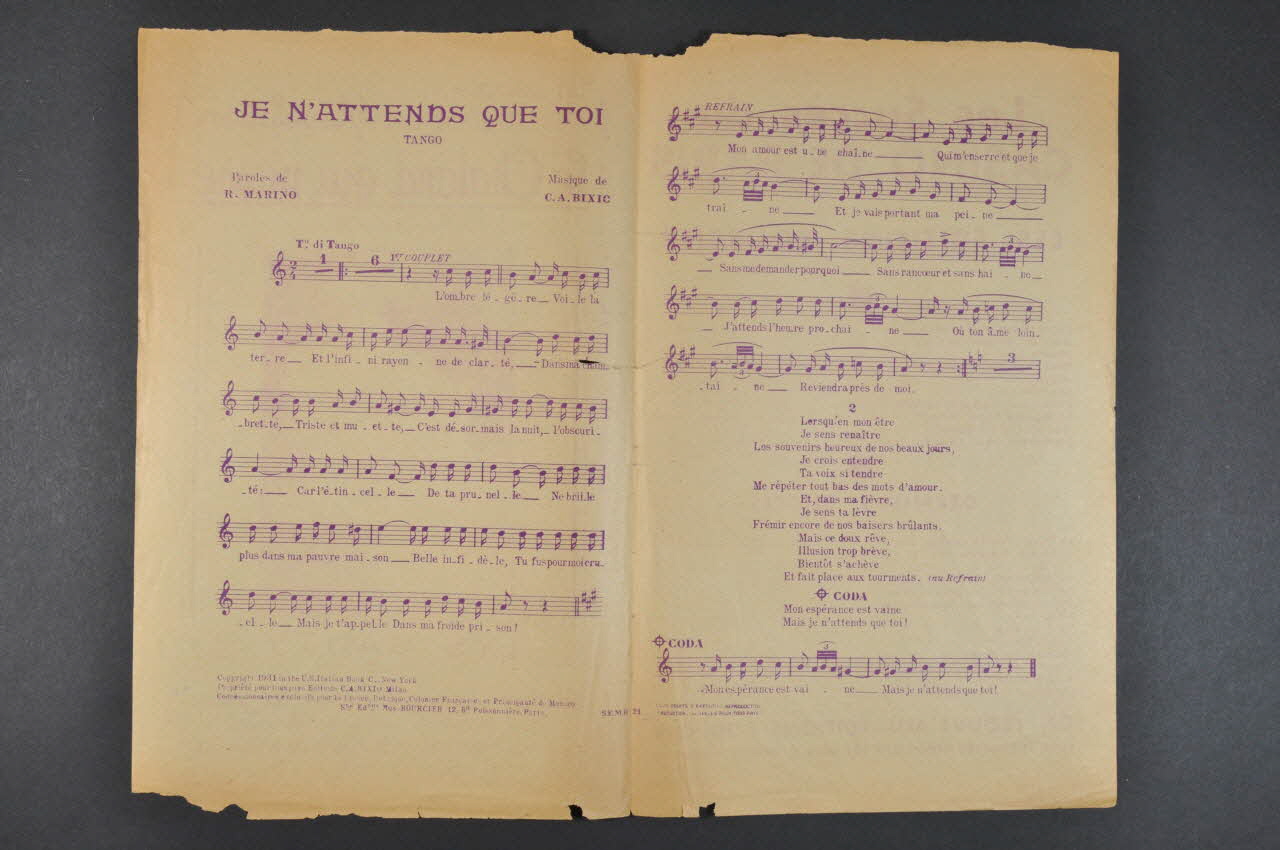 Des inscriptions renseignent le titre, les auteurs, les exécutants et l'éditeur. A l'intérieur, partition et paroles de la chanson. Au dos, liste d'autres partitions publiées par l'éditeur.Décor