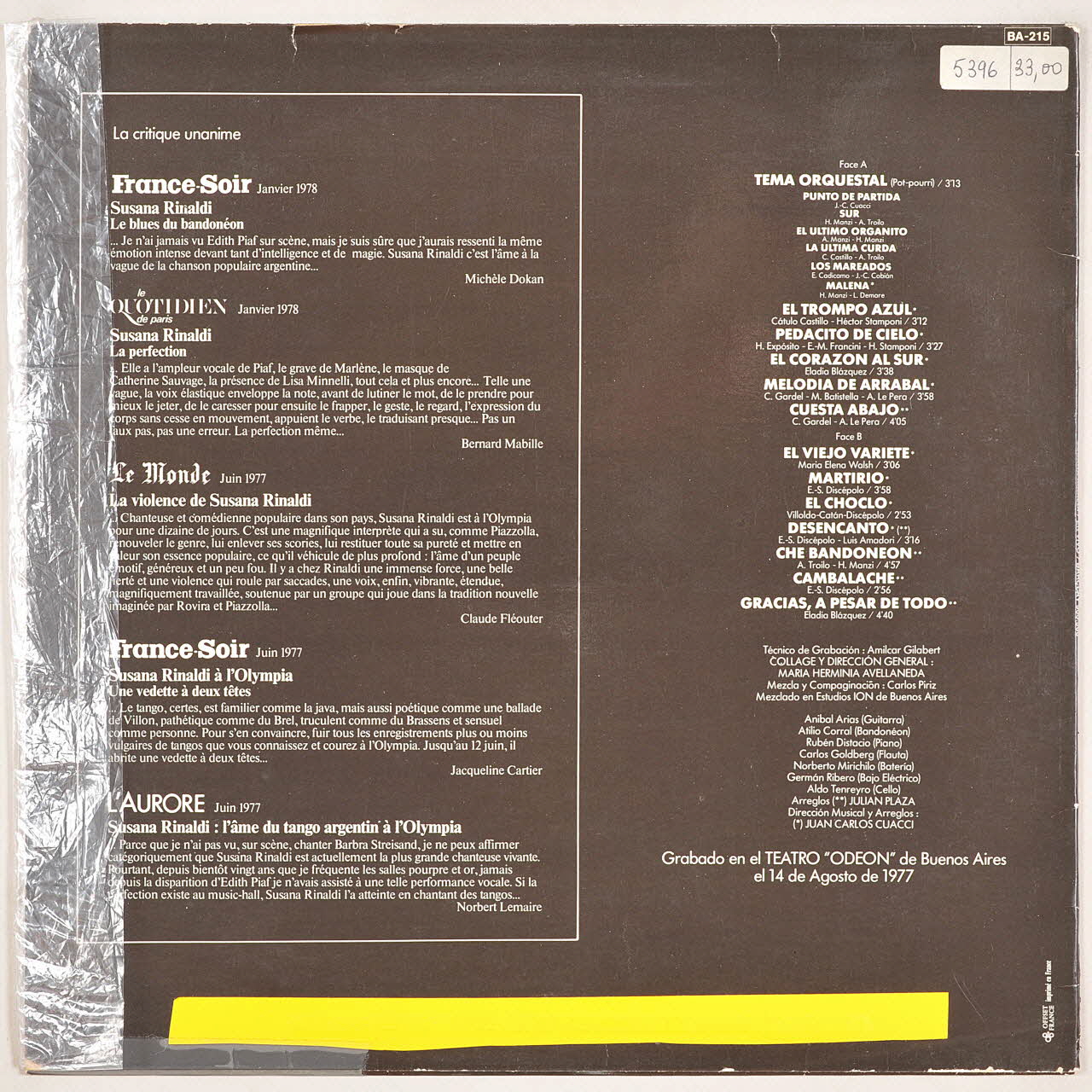 disque 33 tours, Pedacito de cielo, Gracias, a pesar de todo, La ultima curda, El choclo, En vivo, Desencanto, Melodia de Arrabal, Martirio, El ultimo organito, Tema orchestral, Malena, El corazon al sur, El viejo variete, Cambalache, Cuesta Abajo, Los Mareados, Punto de partida, El trompo azul, Che bandoneon, Sur