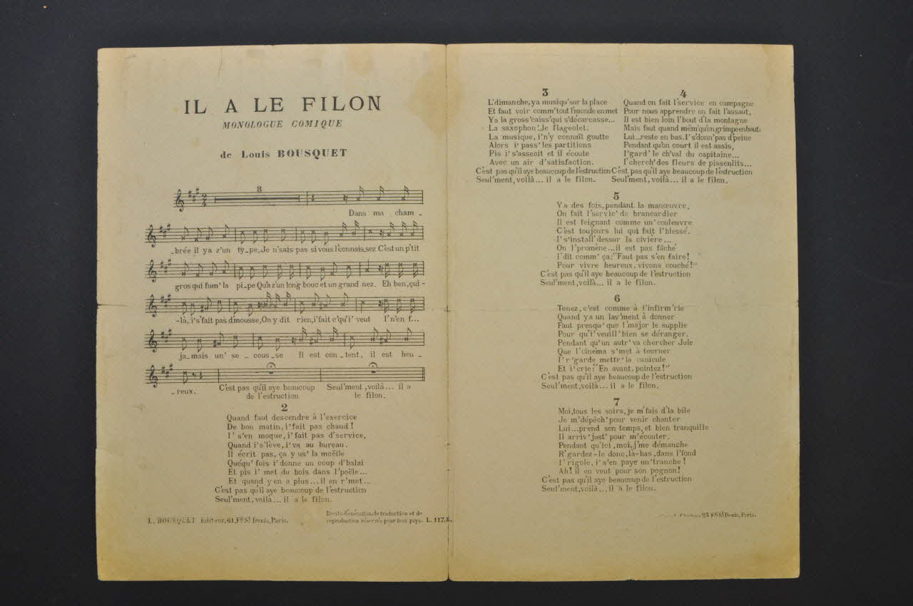 Sur la couverture, la représentation du chasonnier Bach (?) en tenue militaire faisant le salut. Les inscriptions renseignent le titre de la chanson, le nom de l'auteur, des artistes et de l'éditeur. A l'intérieur, partition et paroles de la chanson. Au dos, liste d'autres partitions publiées par l'éditeur.Décor
