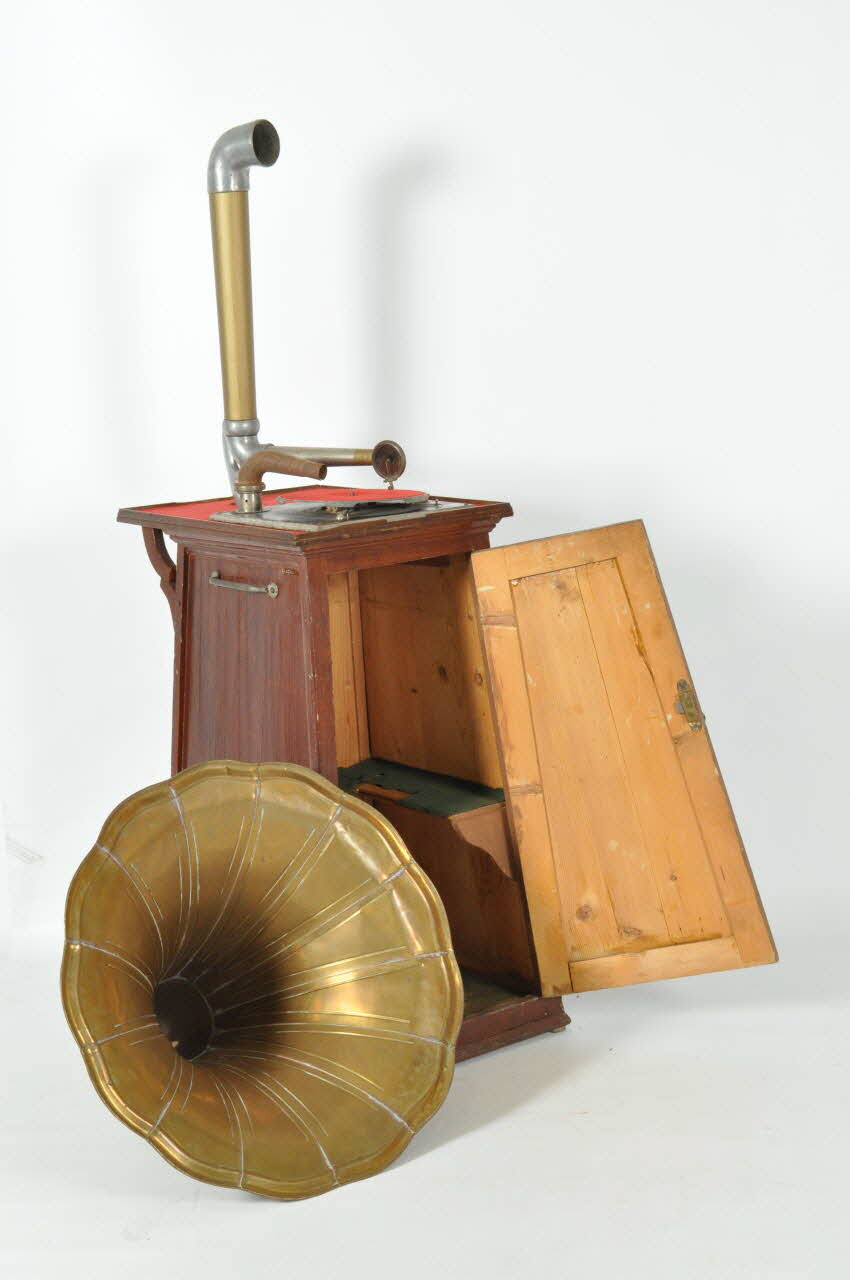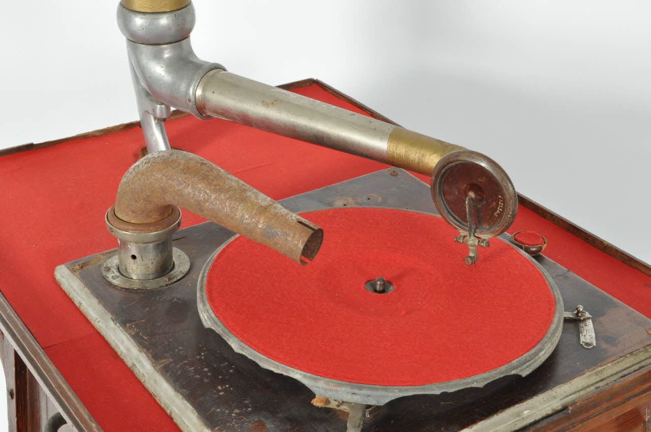 Le tourne-disque en métal recouvert de feutre rouge est fixé dessus et relié à un mécanisme placé à l'intérieur, actionné par une manivelle en métal avec bouton en bois noir tourné sur le côté droit.