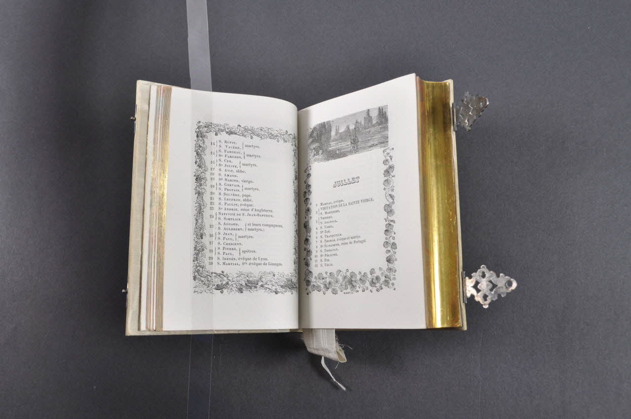 Petit missel de forme rectangulaire dotée d'une couverture en ivoire sur laquelle sont gravées des initiales dans un médaillon quadrilobés. Le système de fermeture du missel s'effectue à l'aide d'un double fermoir en métal argenté. La tranche du missel est dorée et un élément textile permet de marquer les pages.Matériaux et techniques