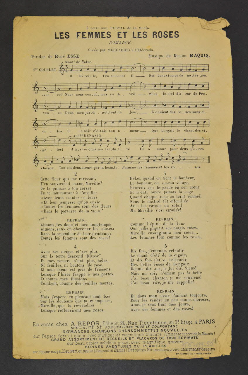 Feuillet rectangulaire en papier industriel, imprimé à l?encre noire. La couverture du feuillet présente un dessin représentant un homme agenouillé auprès d'une femme, entourée de roses. Des inscriptions renseignent le titre de la chanson, le nom des auteurs, de l'artiste et de l'éditeur.