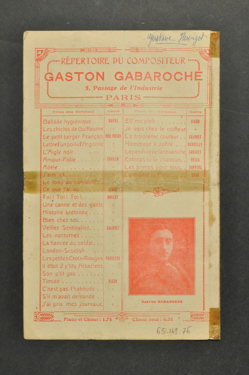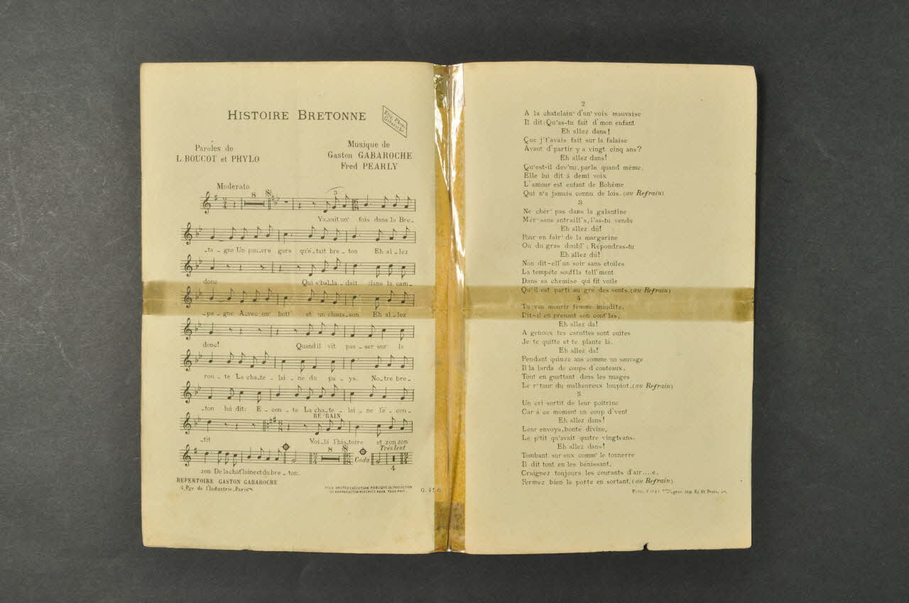 Les inscriptions renseignent le titre de la chanson, le nom des auteurs, de l'artiste et de l'éditeur. A l'intérieur, partitions et paroles de la chanson. Au dos, liste d?autres partitions publiées par l?éditeur.Décor