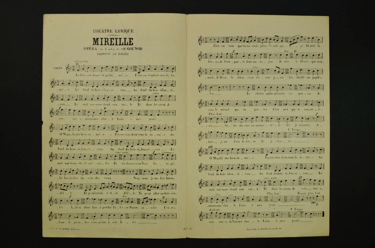 Feuillet rectangulaire en papier industriel, imprimé à l?encre noire. La couverture du feuillet présente la photographie de Gounod dans un médaillon en partie supérieure de la première page.
