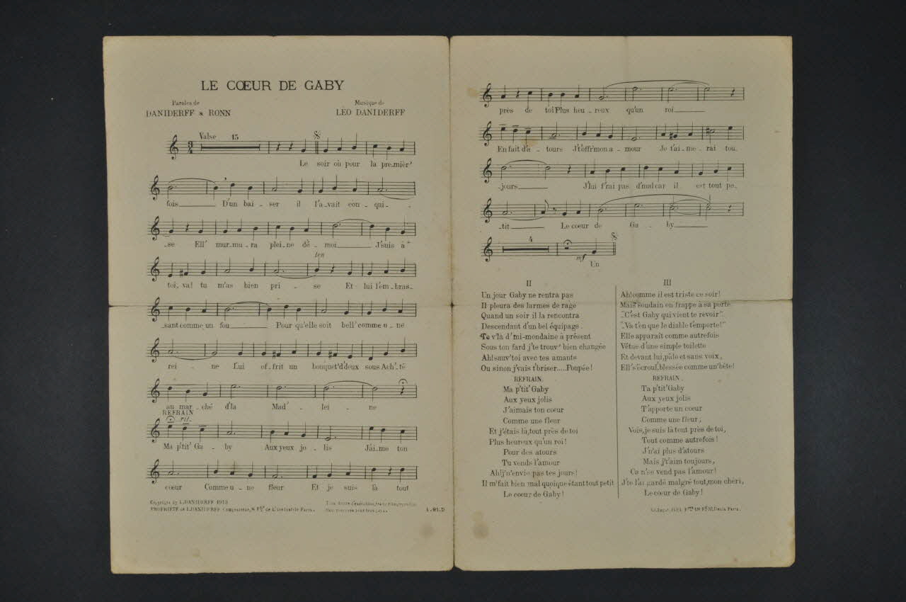 Des inscriptions renseignent le titre, les auteurs, les exécutants et l'éditeur. A l'intérieur, partition et paroles de la chanson. Le revers est laissé vierge.Décor