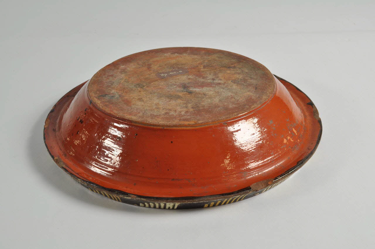 Plat rond en faïence avec un rebord extérieur. Le plat est de fond marron. Le rebord est décoré de traits dégradés. A l'intérieur, un motif végétal avec grosses feuilles dans des corbeilles décore le fond. Les couleurs utilisées sont le vert, le jaune, le orange et le bleu. Cette décoration est disposée autour d'une étoile centrale. Toute cette décoration est en faible relief. L'extérieur est orange.Décor