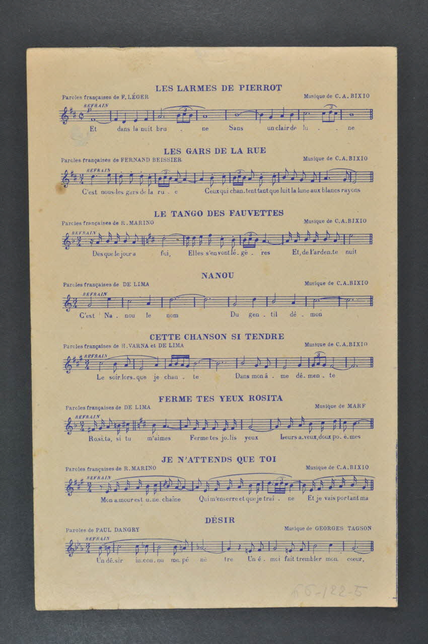 Des inscriptions renseignent le titre, les auteurs, les exécutants et l'éditeur. A l'intérieur, partition et paroles de la chanson. Au dos, liste d'autres partitions publiées par l'éditeur.Décor