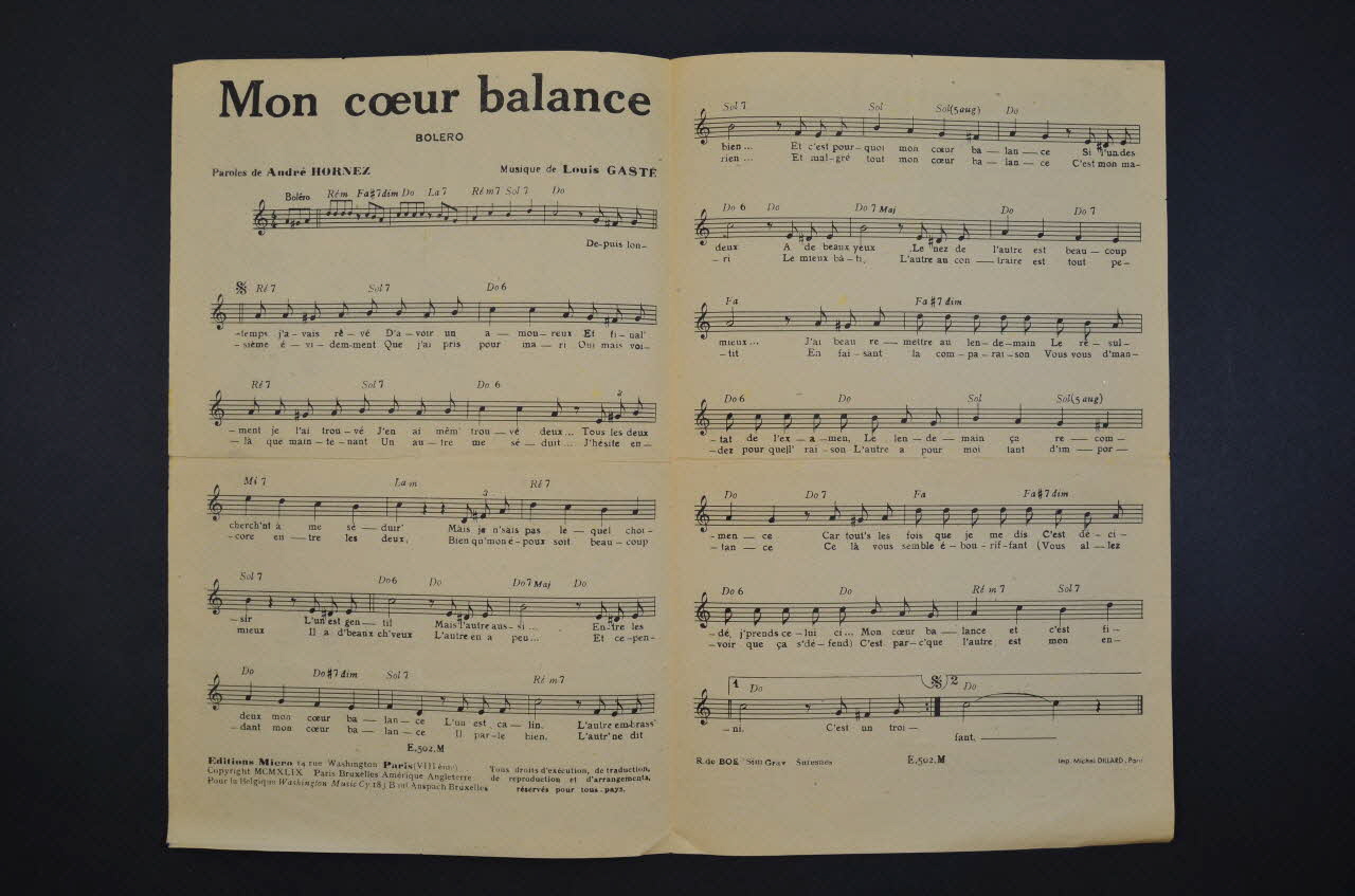 Les inscriptions renseignent le titre de la chanson, le nom des auteurs, de l'artiste et de l'éditeur. A l'intérieur, la partition et les paroles. Au dos, une liste de titres disponibles chez le même éditeur.Décor