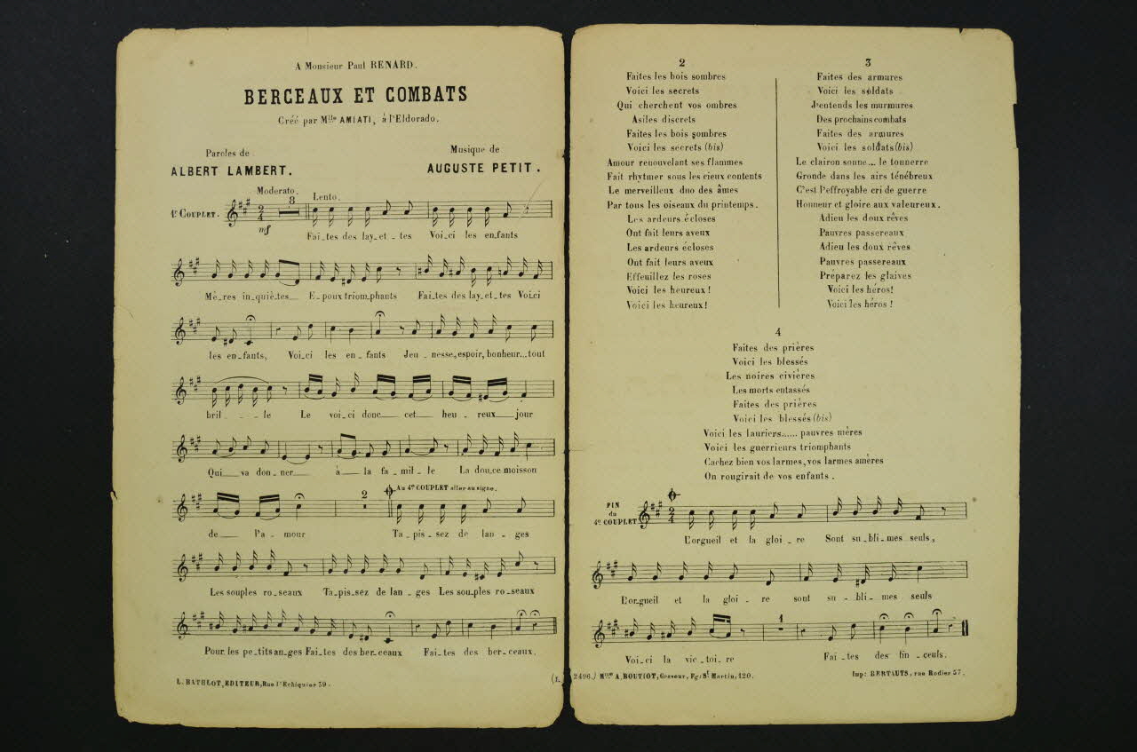 La couverture du feuillet présente le portrait dessiné de Mademoiselle Amiati, en buste. Les inscriptions renseignent le titre de la chanson, le nom des auteurs, de l'artiste et de l'éditeur ainsi que les prix des partitions. A l'intérieur, partition et paroles de la chanson. Le dos est laissé vierge. Suite à une déchirure de la tranche sur toute sa hauteur, la partition se présente en deux morceaux.Décor