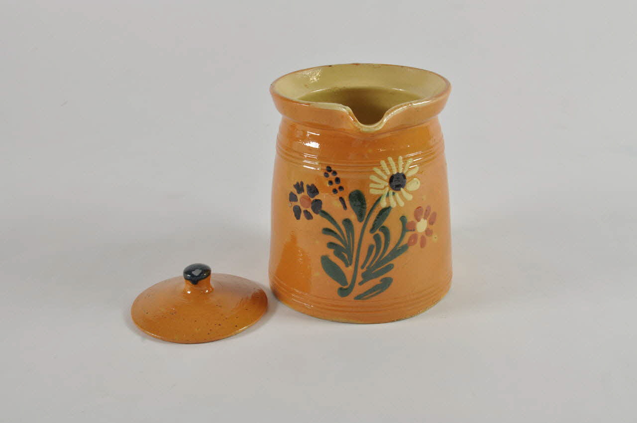 Argile façonnée au tour, recouverte d'un engobe, à barbotine blanche, à décor peint en bleu noir, vert, ocre, à glaçure jaune à l'intérieur, ocre à l'extérieur / De forme cylindrique, broc à bords droits, resserrés vers le haut ; base à moulure rentrante ; bord supérieur en bandeau plat débordant, à bec verseur ; anse latérale fixée du tiers supérieur à la base ; couvercle avec bouton de préhension. Filet médian et décor sous le bec verseur de fleurs et de feuilles.