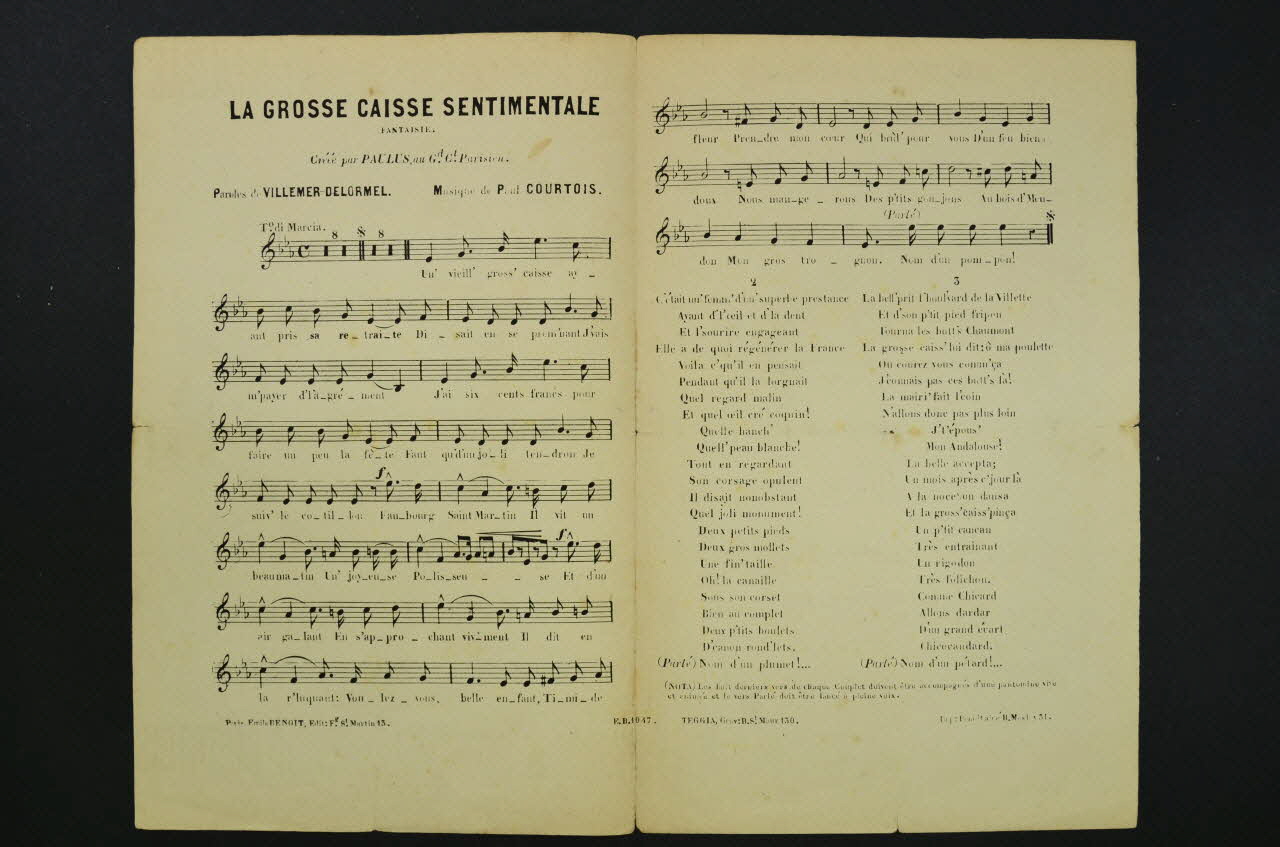 La couverture du feuillet porte un dessin figurant Paulus tapant sur une grosse caisse ornée de son effigie, à droite, en arrière-plan, une jeune femme marchant le regarde. Les inscriptions renseignent le titre de la chanson, le nom des auteurs, de l'artiste et de l'éditeur. A l'intérieur, partition et paroles de la chanson. Au dos, liste d'autres partitions publiées par l'éditeur.Décor