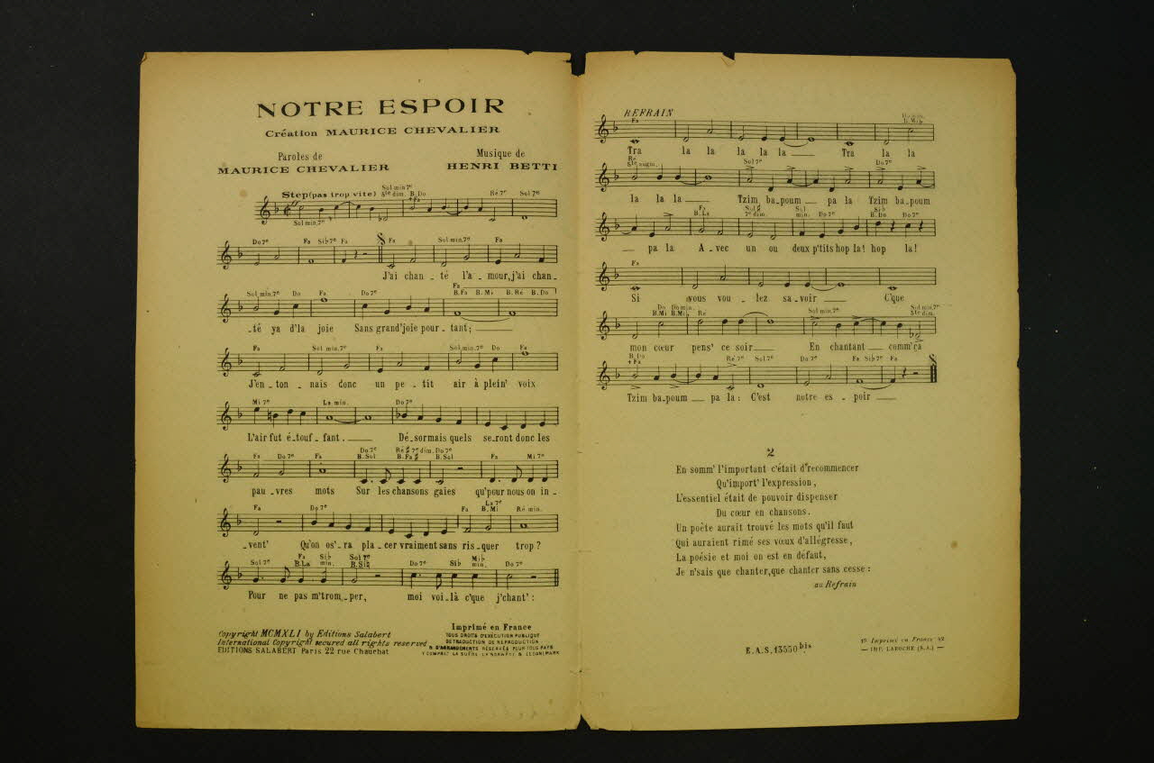 Des inscriptions renseignent le titre, les auteurs, les exécutants et l'éditeur. A l'intérieur, partition et paroles de la chanson. Au dos, liste d'autres partitions publiées par l'éditeur.Matériaux et techniques