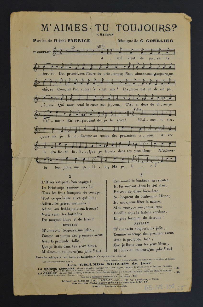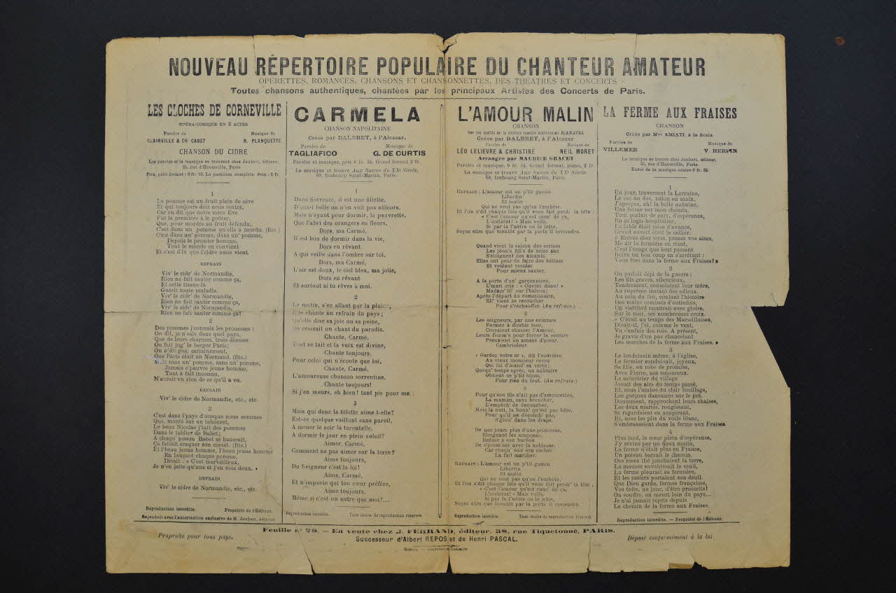 Les inscriptions renseignent le titre de la chanson, le nom des auteurs, de l'artiste et de l'éditeur. A l'intérieur et au dos, les partitions et les paroles des chansons.Décor
