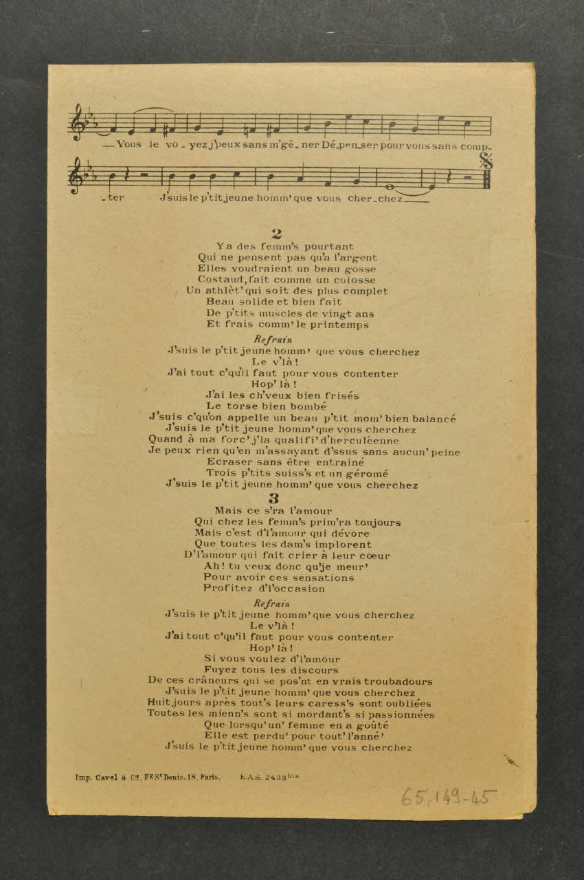 Les inscriptions renseignent le nom des auteurs, de l'artiste et de l'éditeur. Au dos partitions et paroles de la chanson. L'intérieur est laissé vierge.Matériaux et techniques
