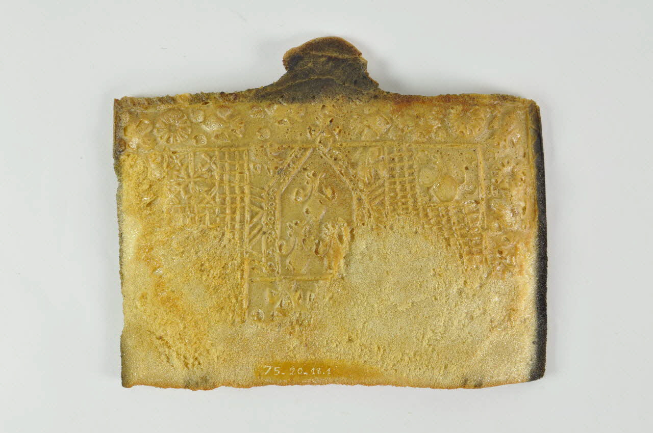 Plaque de forme rectangulaire avec décor en relief sur les deux faces. Un dépassement semi-circulaire est présent sur un grand côté.