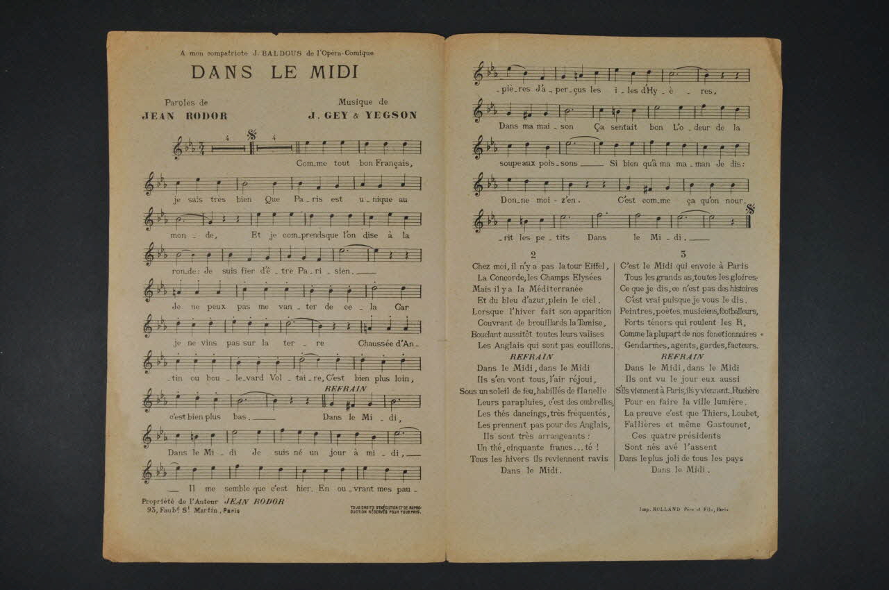 Des inscriptions renseignent le titre, les auteurs, les exécutants et l'éditeur. A l'intérieur, partition et paroles de la chanson. Au dos, liste d'autres partitions publiées par l'éditeur.Décor