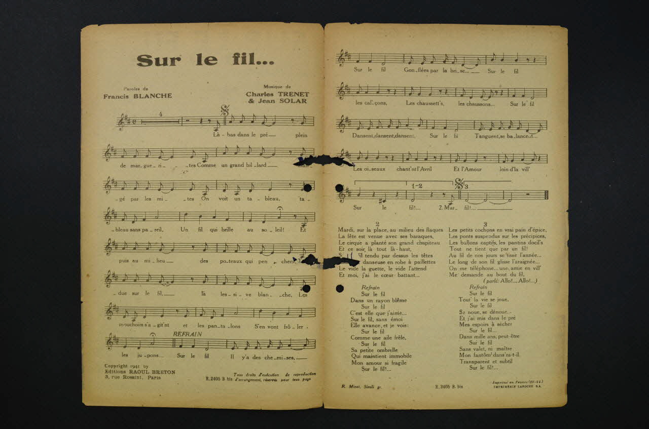 Feuillet rectangulaire en papier industriel, imprimé à l?encre bleue (sauf l?intérieur à l?encre noire). La couverture du feuillet présente la photographie de Charles Trénet.