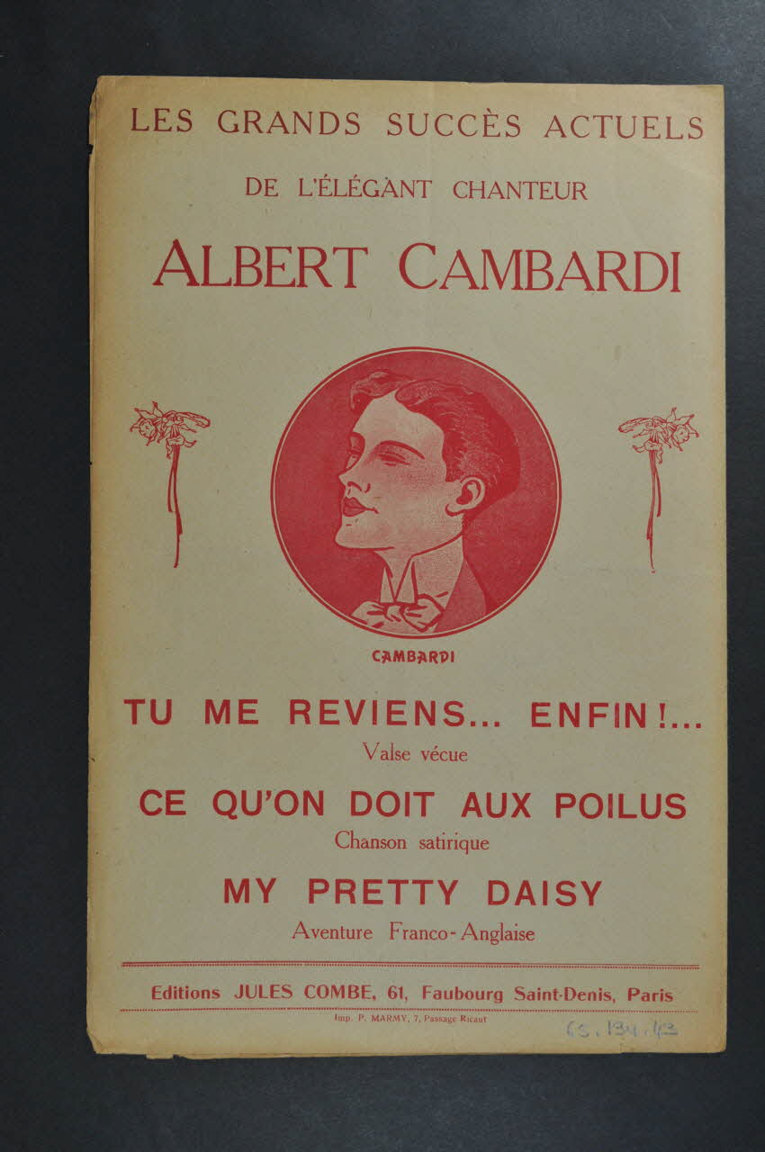 Les inscriptions renseignent le titre de la chanson, le nom des auteurs, de l'artiste et de l'éditeur. A l'intérieur, partitions et paroles de la chanson. Au dos, liste d?autres partitions publiées par l?éditeur.Décor