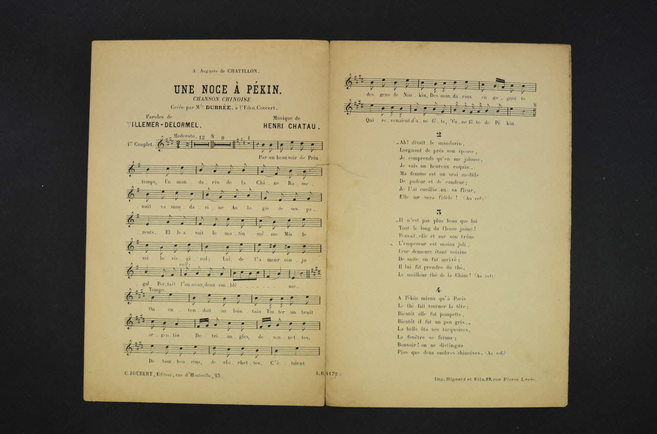 Des inscriptions renseignent le titre, les auteurs, les exécutants et l'éditeur. A l'intérieur, partition et paroles de la chanson. Au dos, liste d'autres partitions publiées par l'éditeur.Décor