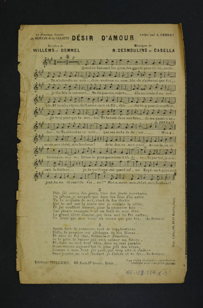 Les inscriptions renseignent le titre de la chanson, le nom des auteurs, de l'artiste et de l'éditeur. A l'intérieur et au dos, les partitions et paroles des chansons.Décor