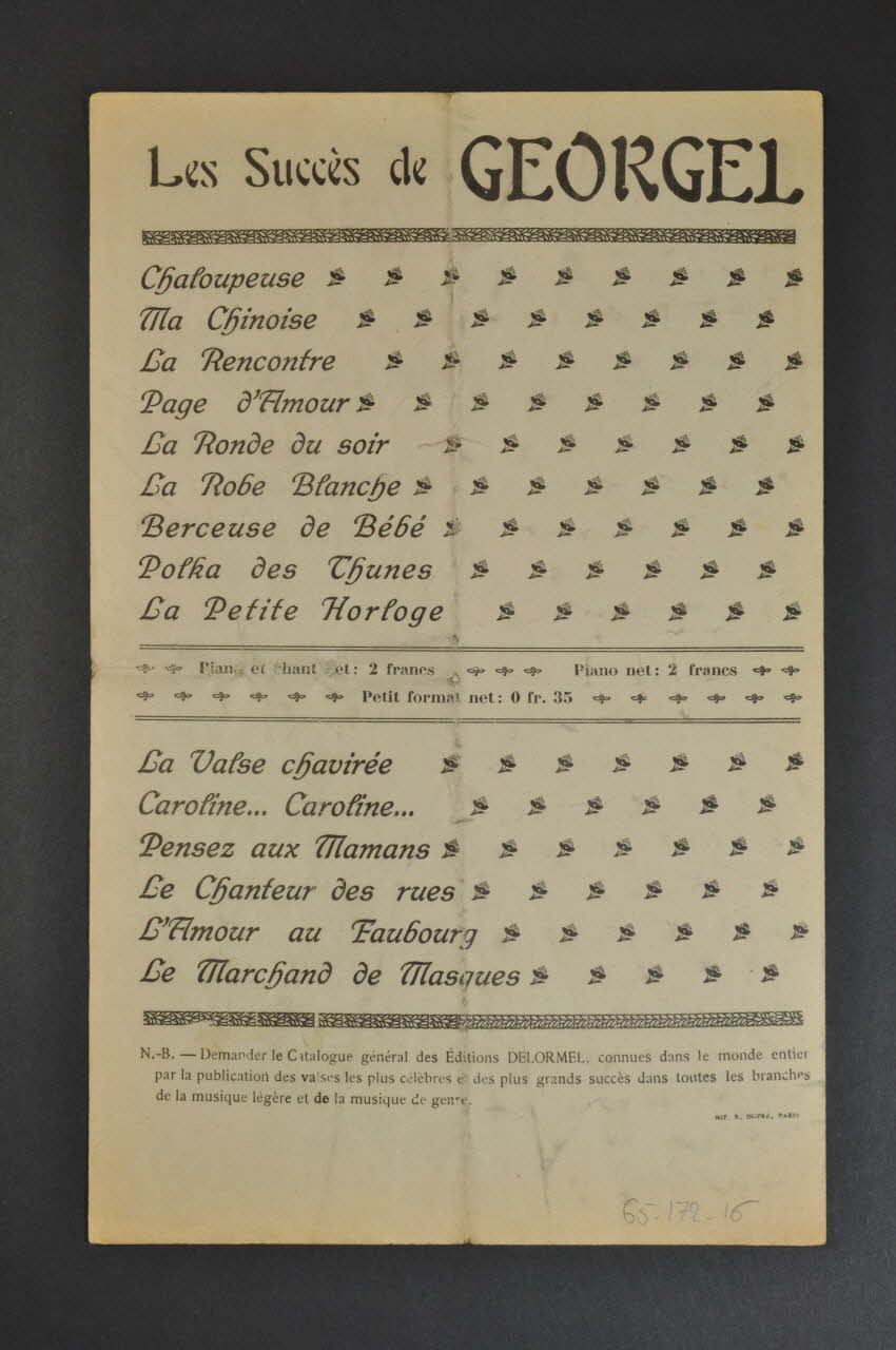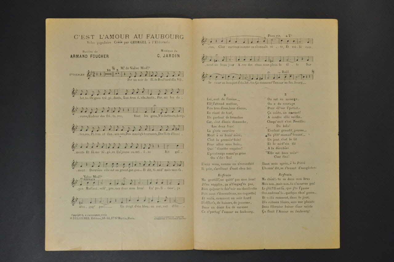 Les inscriptions renseignent le titre de la chanson, le nom des auteurs, de l'artiste et de l'éditeur. A l'intérieur, partitions et paroles de la chanson. Au dos, liste d?autres partitions publiées par l?éditeur.Décor